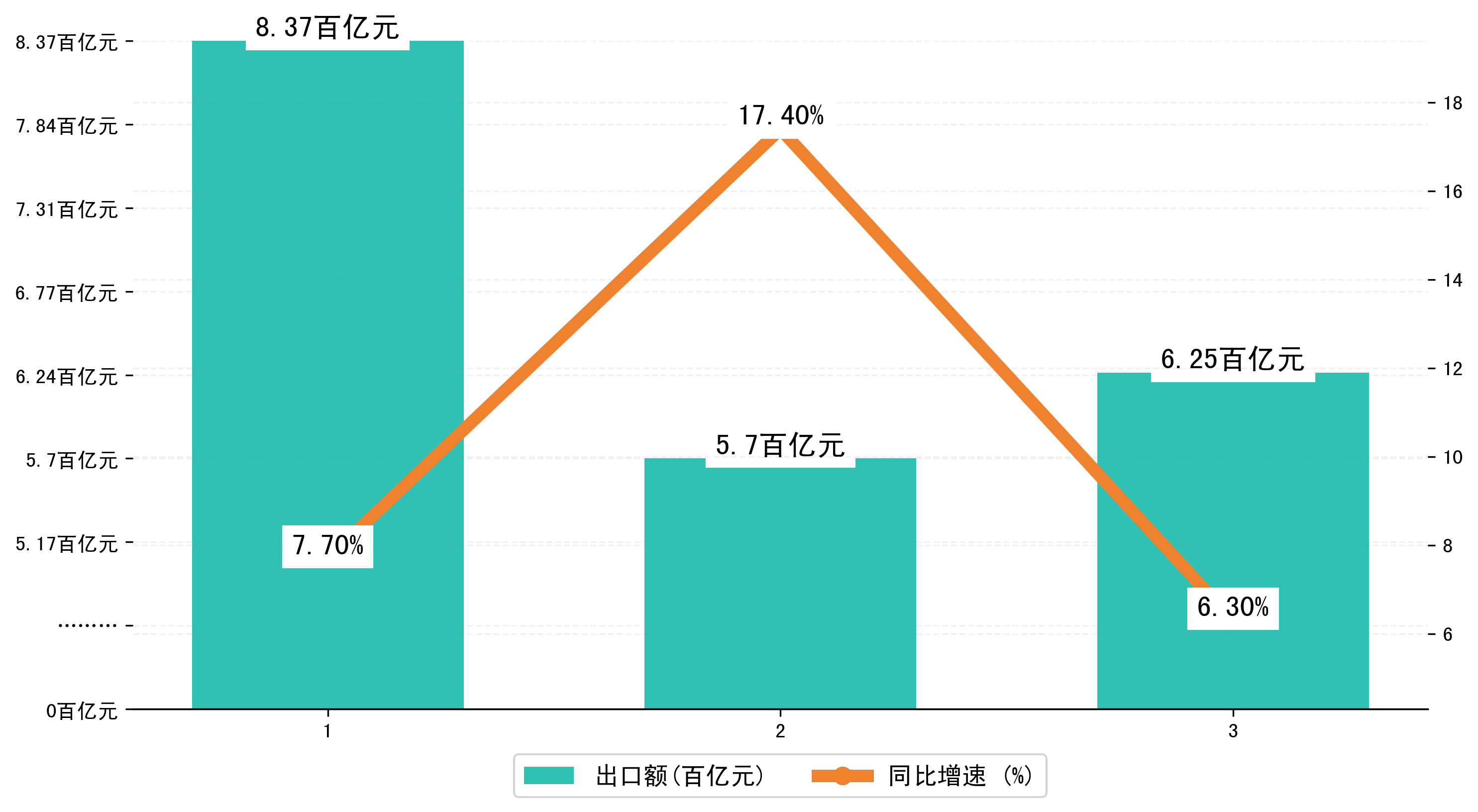 以美元计,2024年1-3月宁波市出口额为286,0521.0648万美元,相比上年同期增加了7,9837.5249万美元,同比增加2.90%。