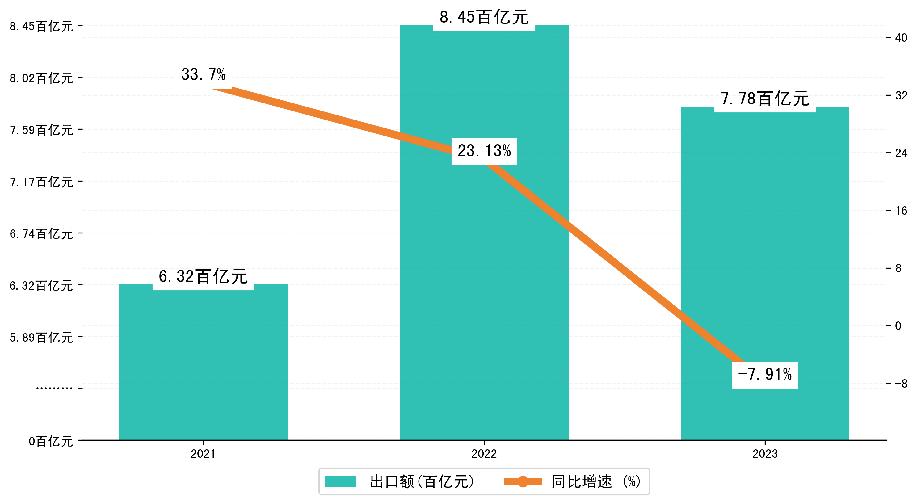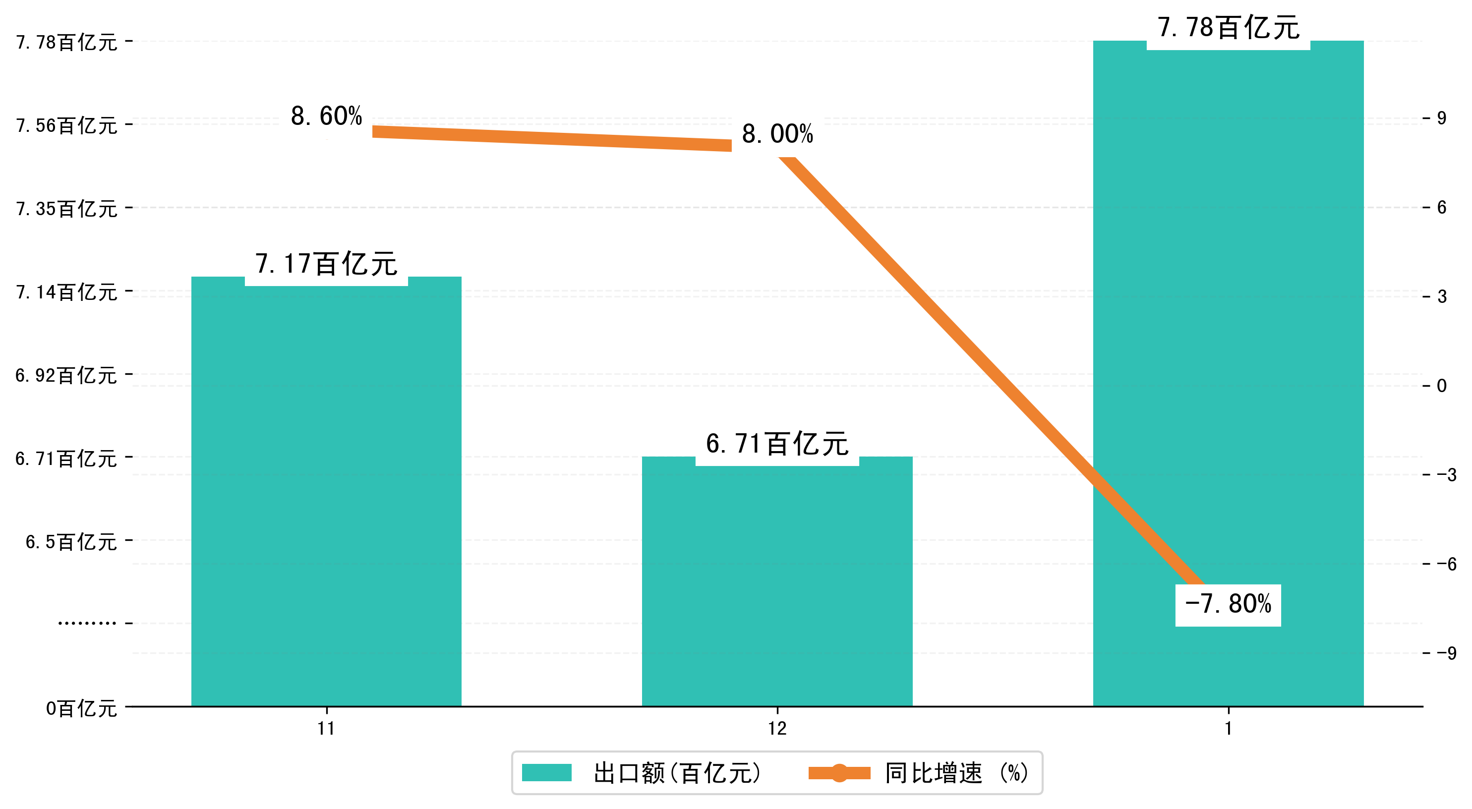 以人民币计,2023年1-1月宁波市出口额为777,6695.5027万元,相比上年同期减少了66,8428.7115万元,同比减少了-7.80%。