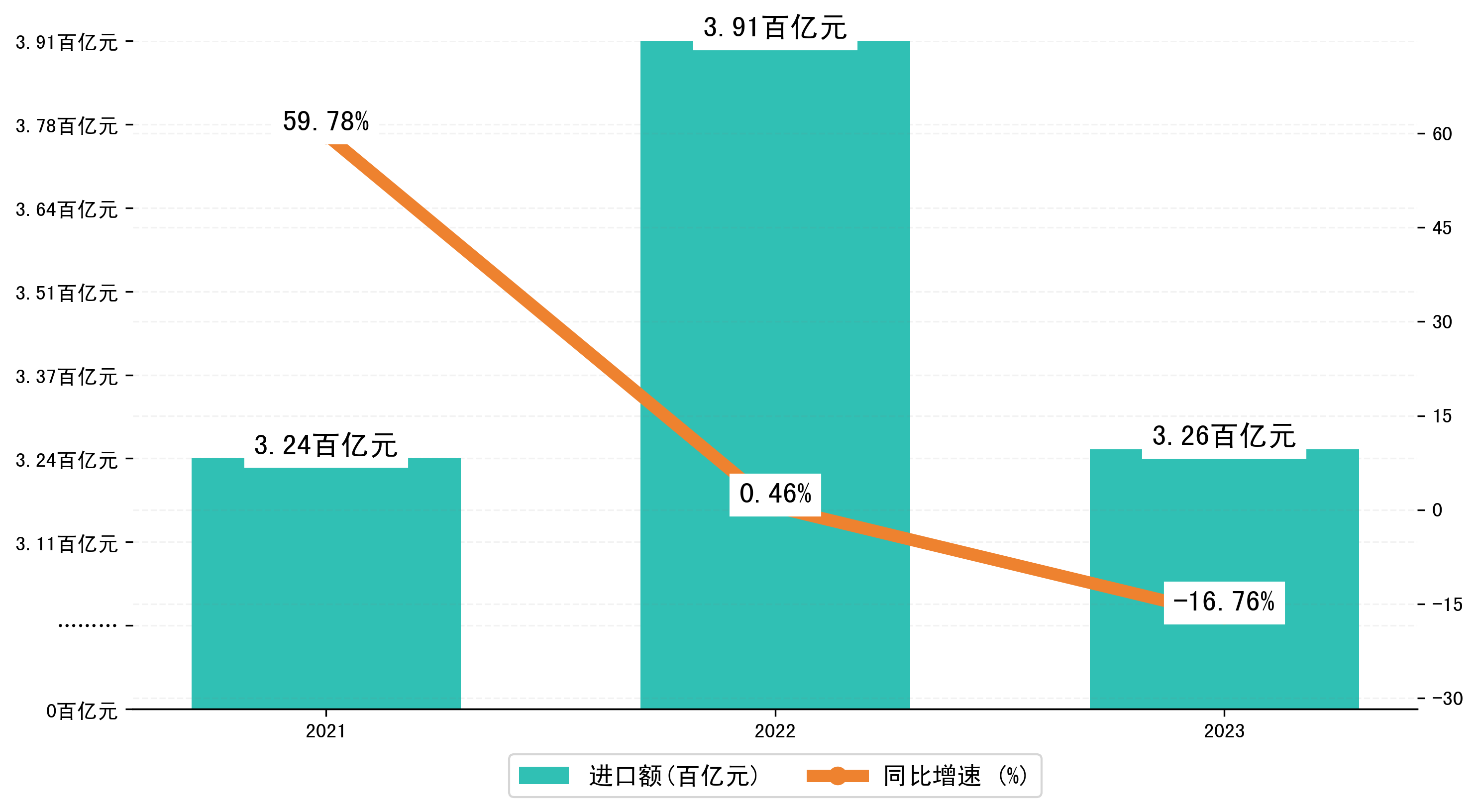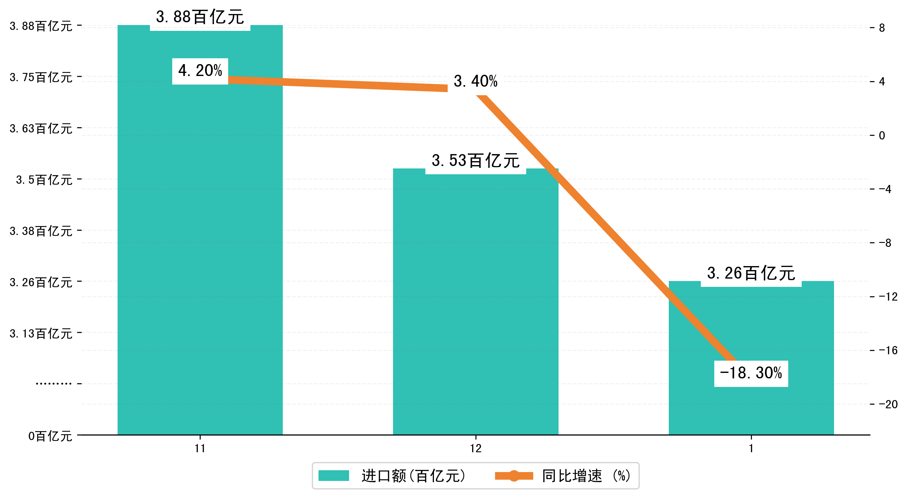 以人民币计,2023年1-1月宁波市进口额为325,5641.9112万元,相比上年同期减少了65,5647.8806万元,同比减少了-18.30%。