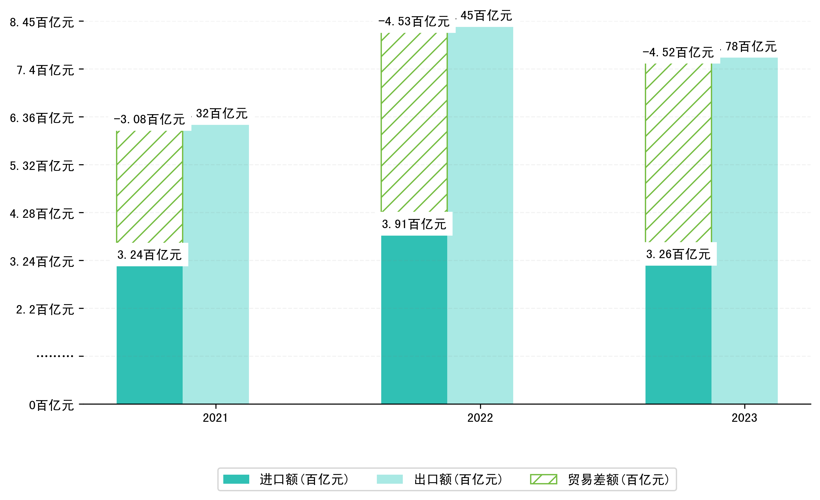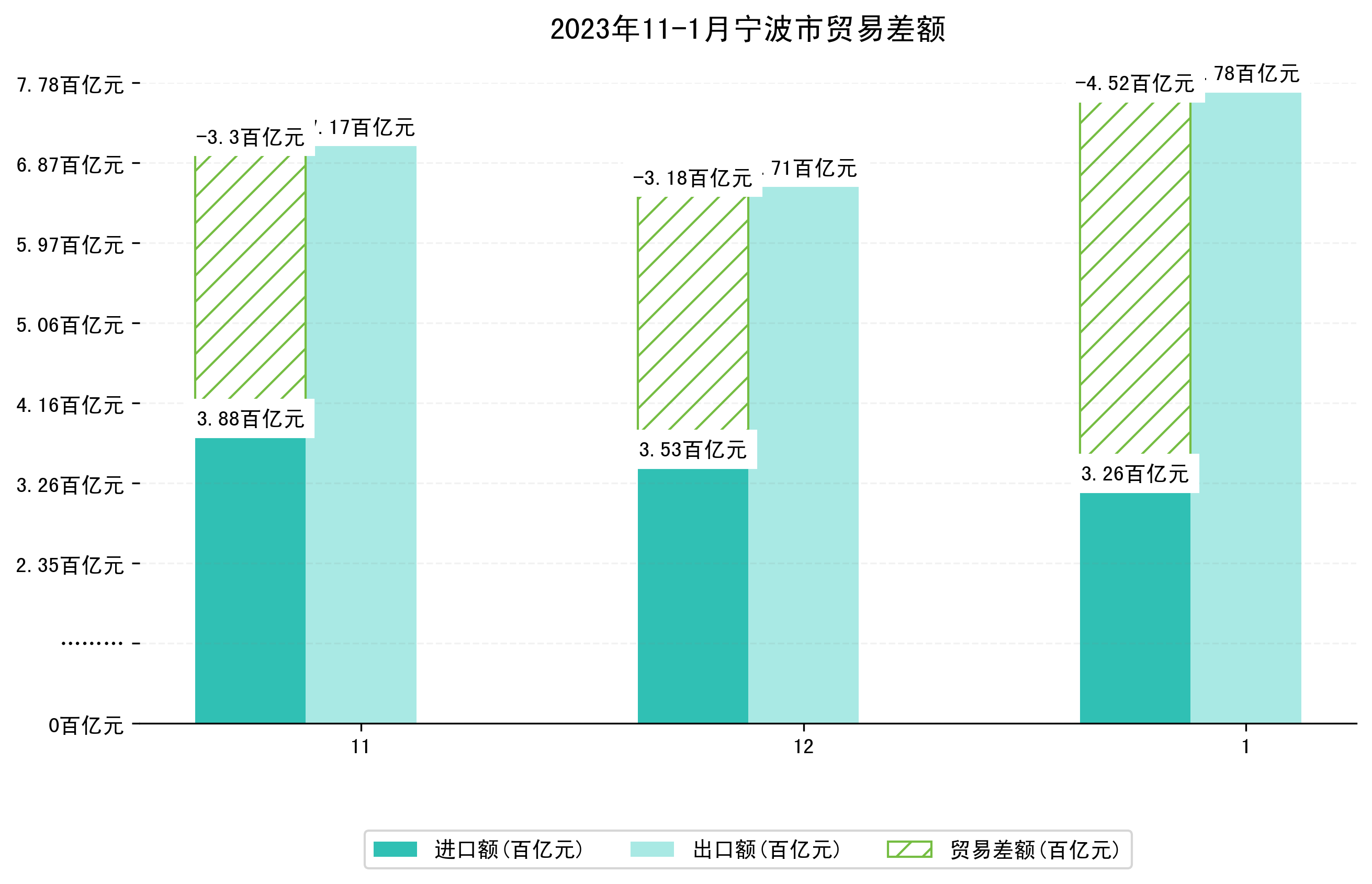 以人民币计,2023年1-1月宁波市贸易差额为452,1053,5915万元(贸易顺差),相比上年同期减少了1,2780,8309万元,同比减少-0.28%。