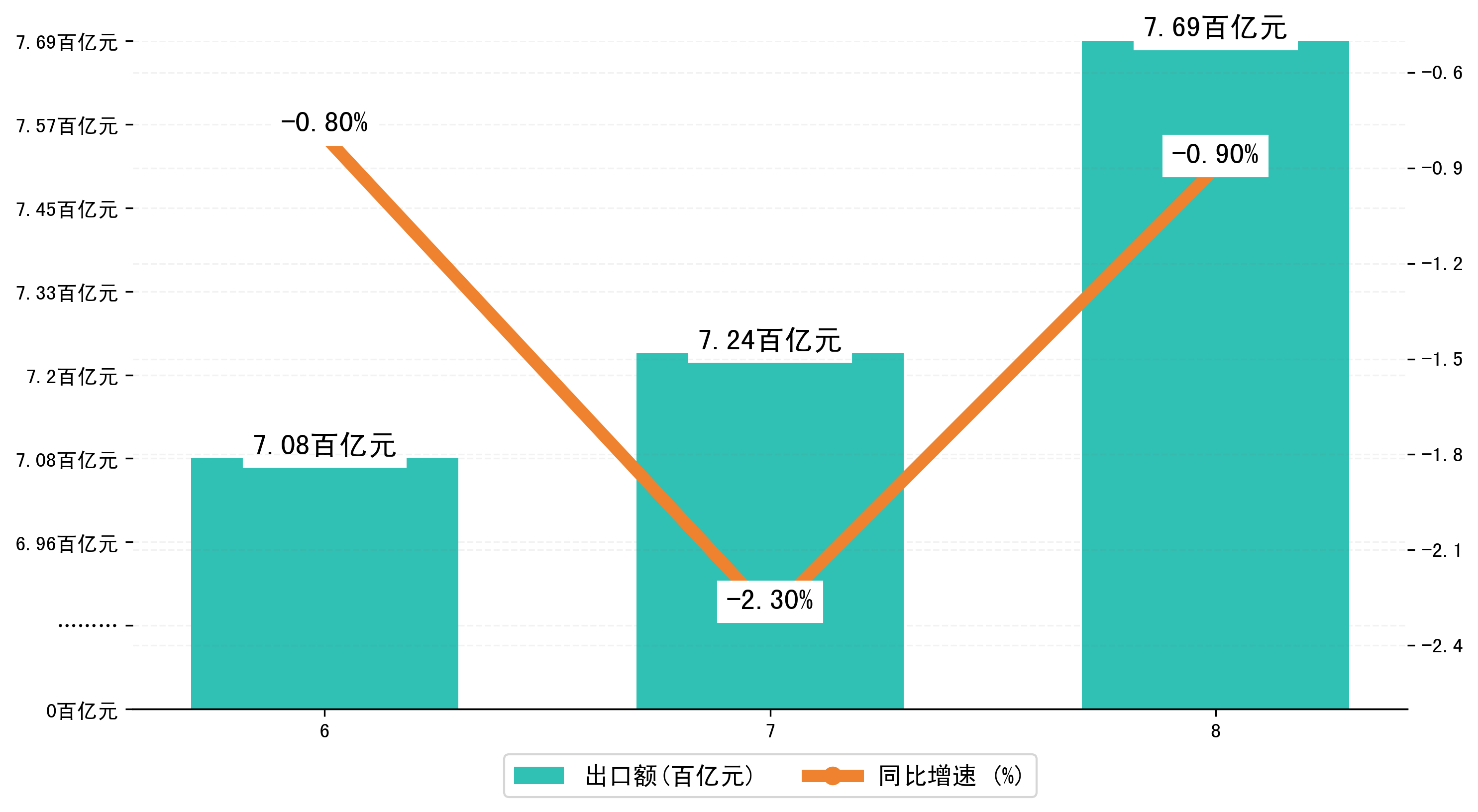 以美元计,2023年1-8月宁波市出口额为796,4741.6082万美元,相比上年同期减少了62,9053.7946万美元,同比减少-7.30%。