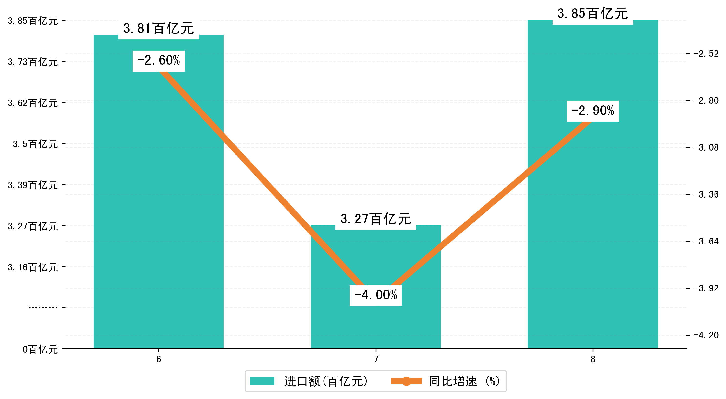 以人民币计,2023年8月宁波市进口额为384,9970.4156万元,相比上月增加了57,8867.1075万元;相比上年同期增加了14,8024.0723万元,同比减少了-2.90%。
