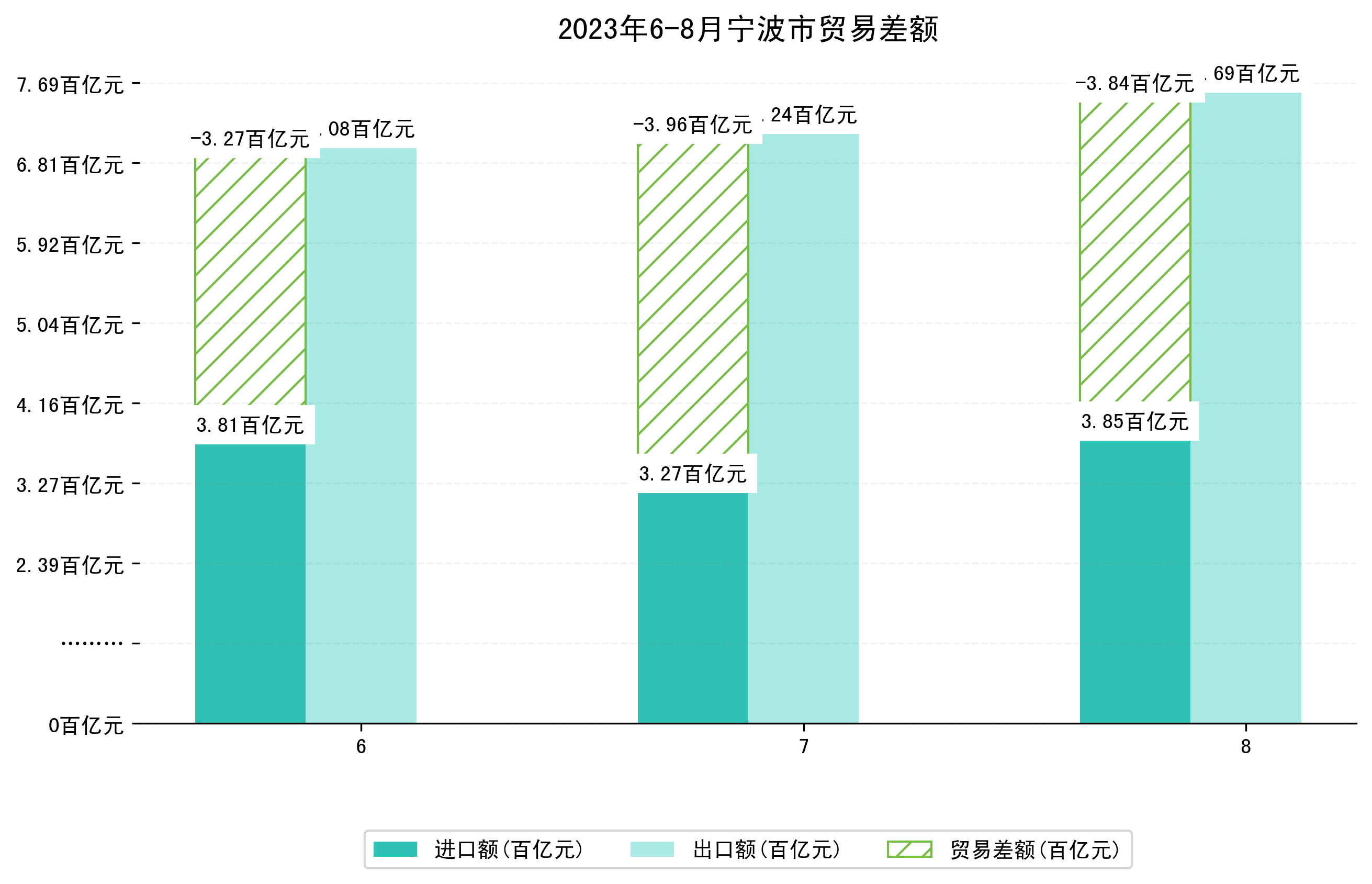 以美元计,2023年8月宁波市贸易差额为53,7138,6487万美元(贸易顺差),相比上月减少了1,8170,5428万美元;相比上年同期增加了3,4113,5228万美元,同比增加6.78%。