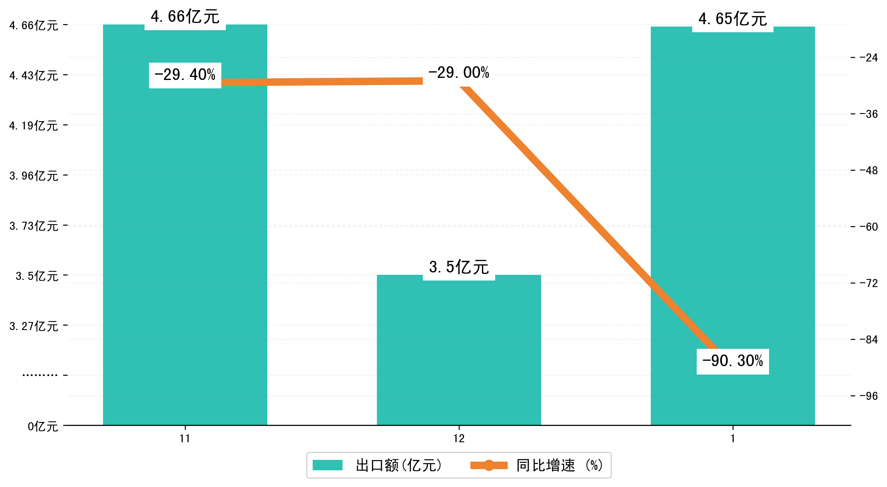 以人民币计,2024年1-1月萍乡市出口额为4,6470.5009万元,相比上年同期减少了53,4556.5126万元,同比减少了-90.30%。