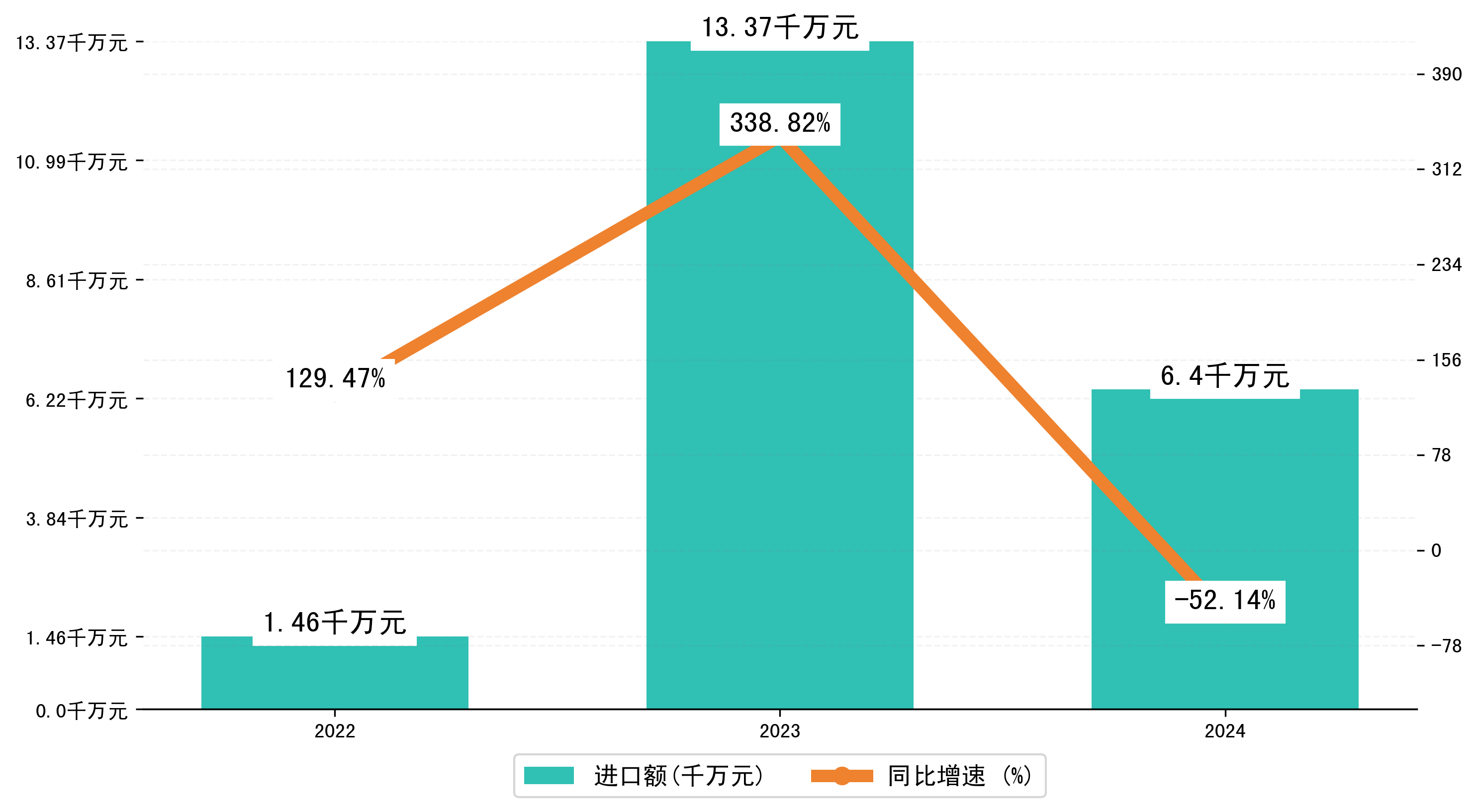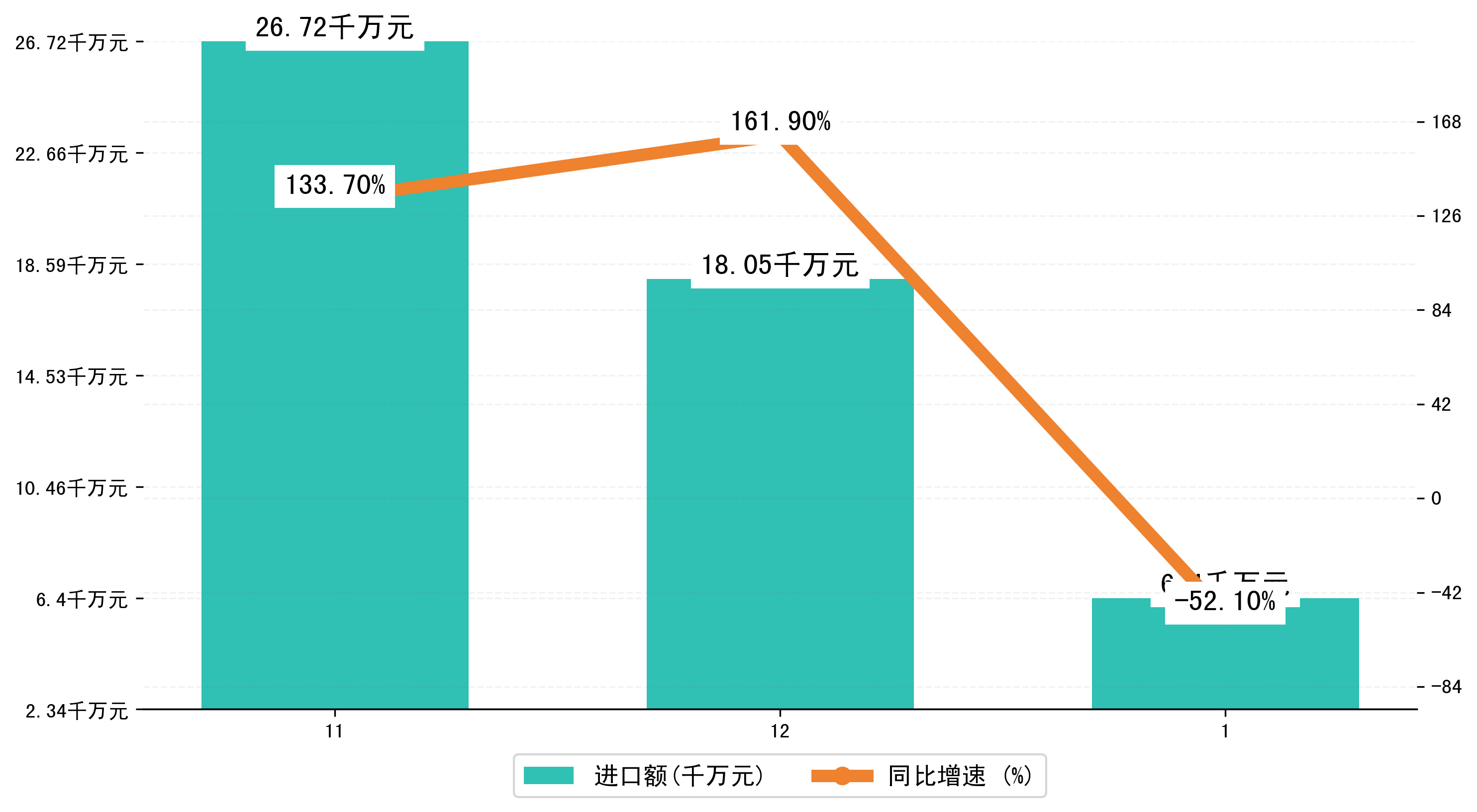 以人民币计,2024年1-1月萍乡市进口额为6399.8473万元,相比上年同期减少了6973.1455万元,同比减少了-52.10%。