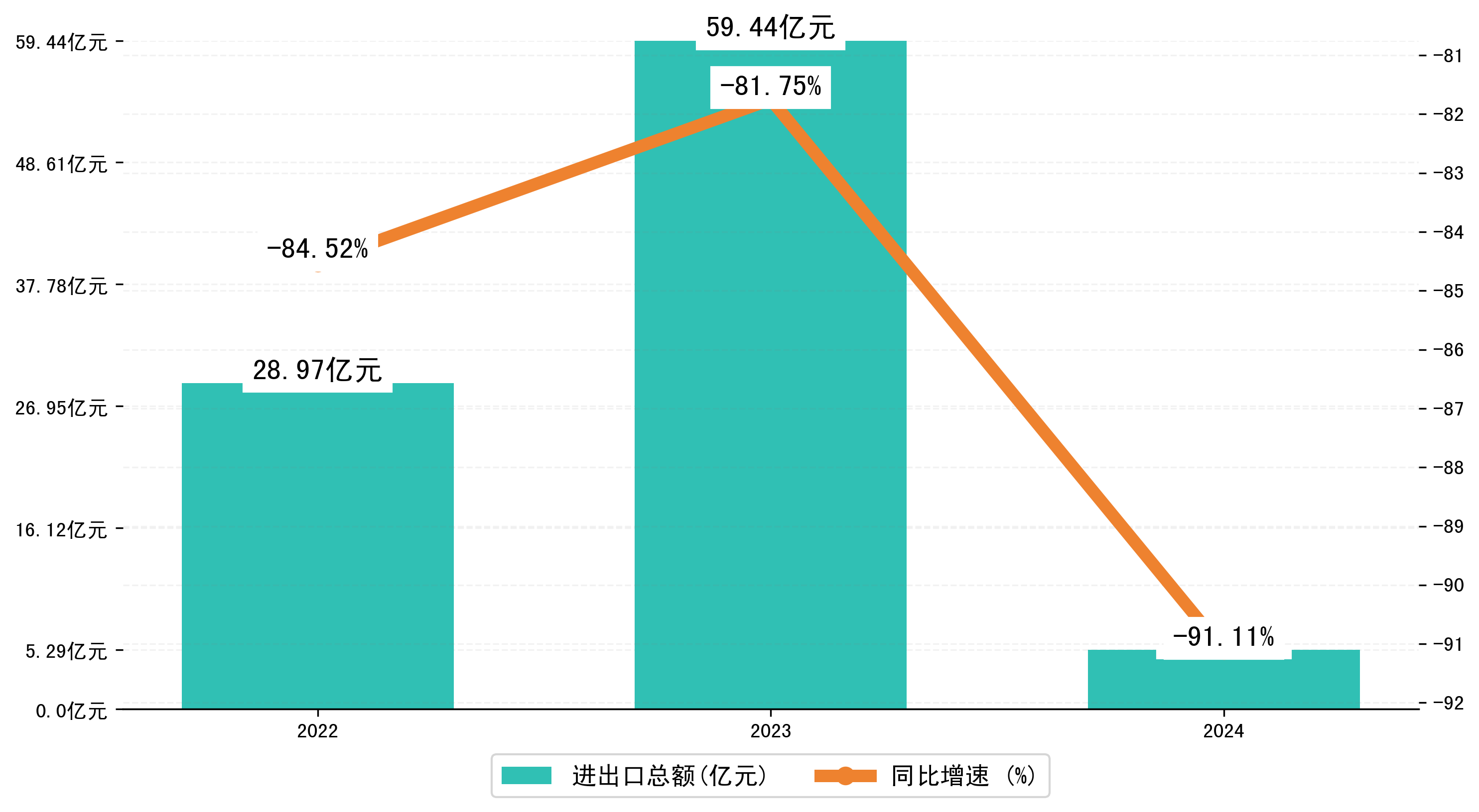 以人民币计,2024年1-1月萍乡市进出口总额为5,2870.3483万元,相比上年同期减少了54,1529.658万元,同比减少了-89.20%。