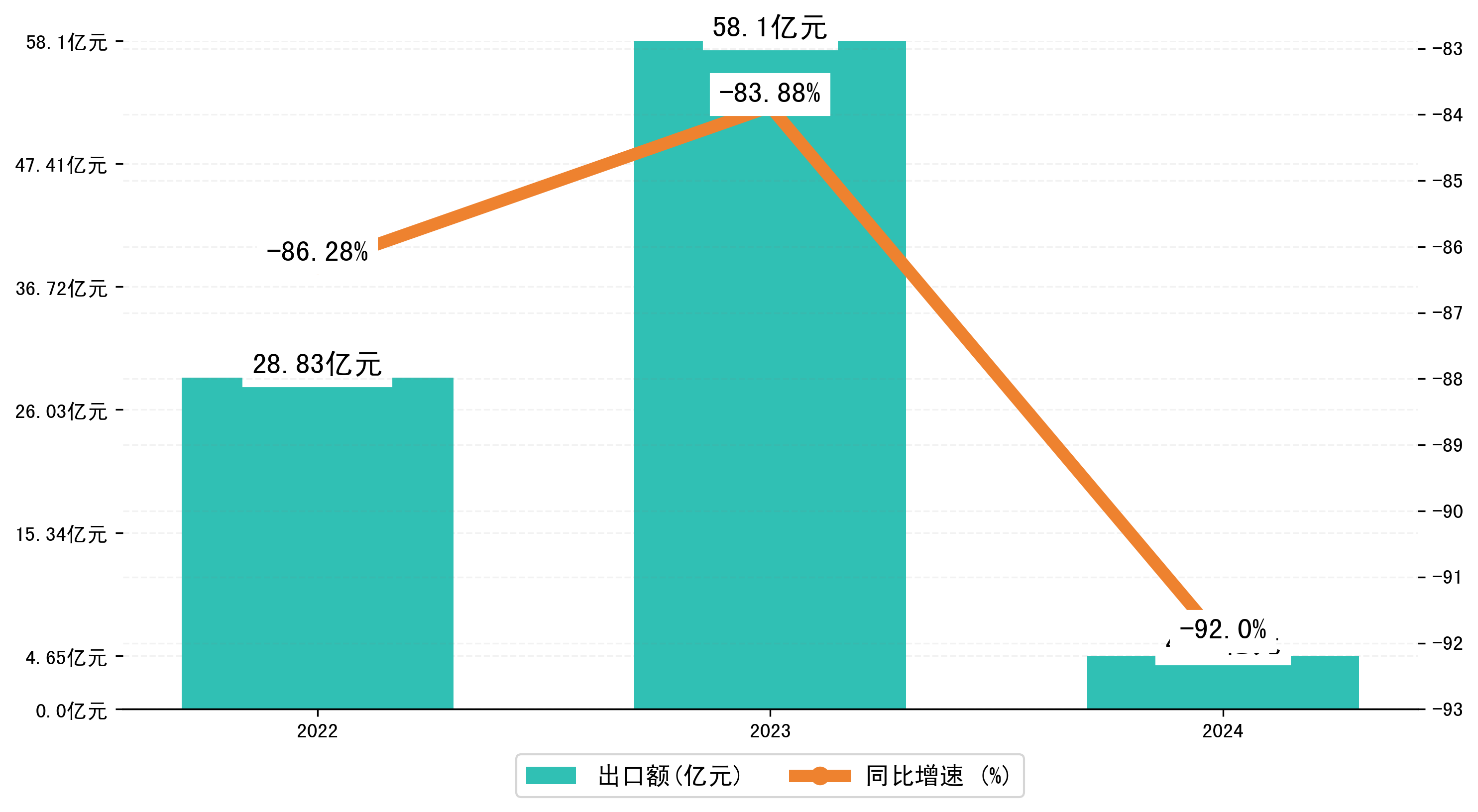 以美元计,2024年1-1月萍乡市出口额为6542.9966万美元,相比上年同期减少了7,6773.5898万美元,同比减少-90.40%。