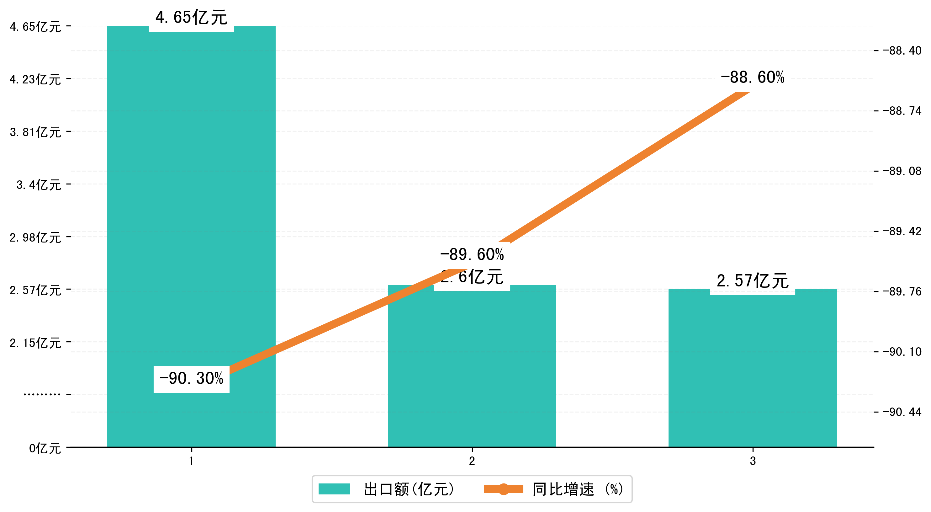 以美元计,2024年3月萍乡市出口额为3611.4716万美元,相比上月减少了41.9864万美元;相比上年同期减少了2,4606.9359万美元,同比减少-88.90%。