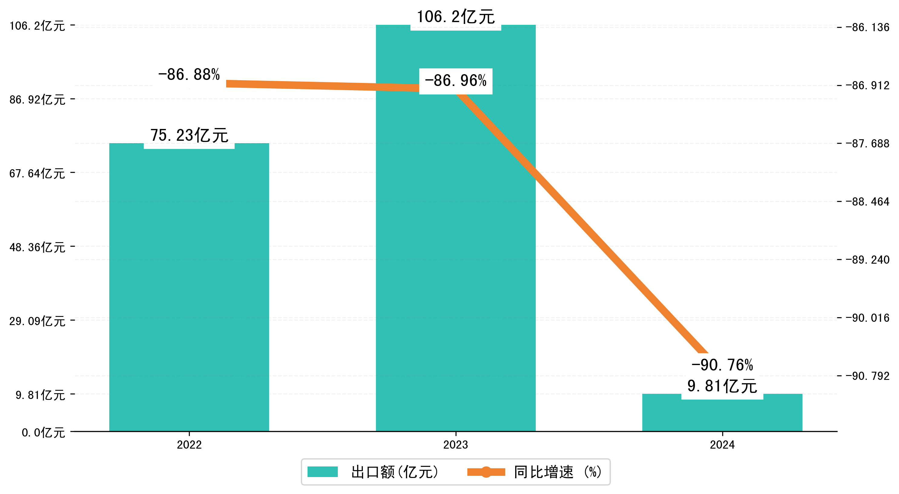 以人民币计,2024年1-3月萍乡市出口额为9,8104.6325万元,相比上年同期减少了96,3852.514万元,同比减少了-88.60%。