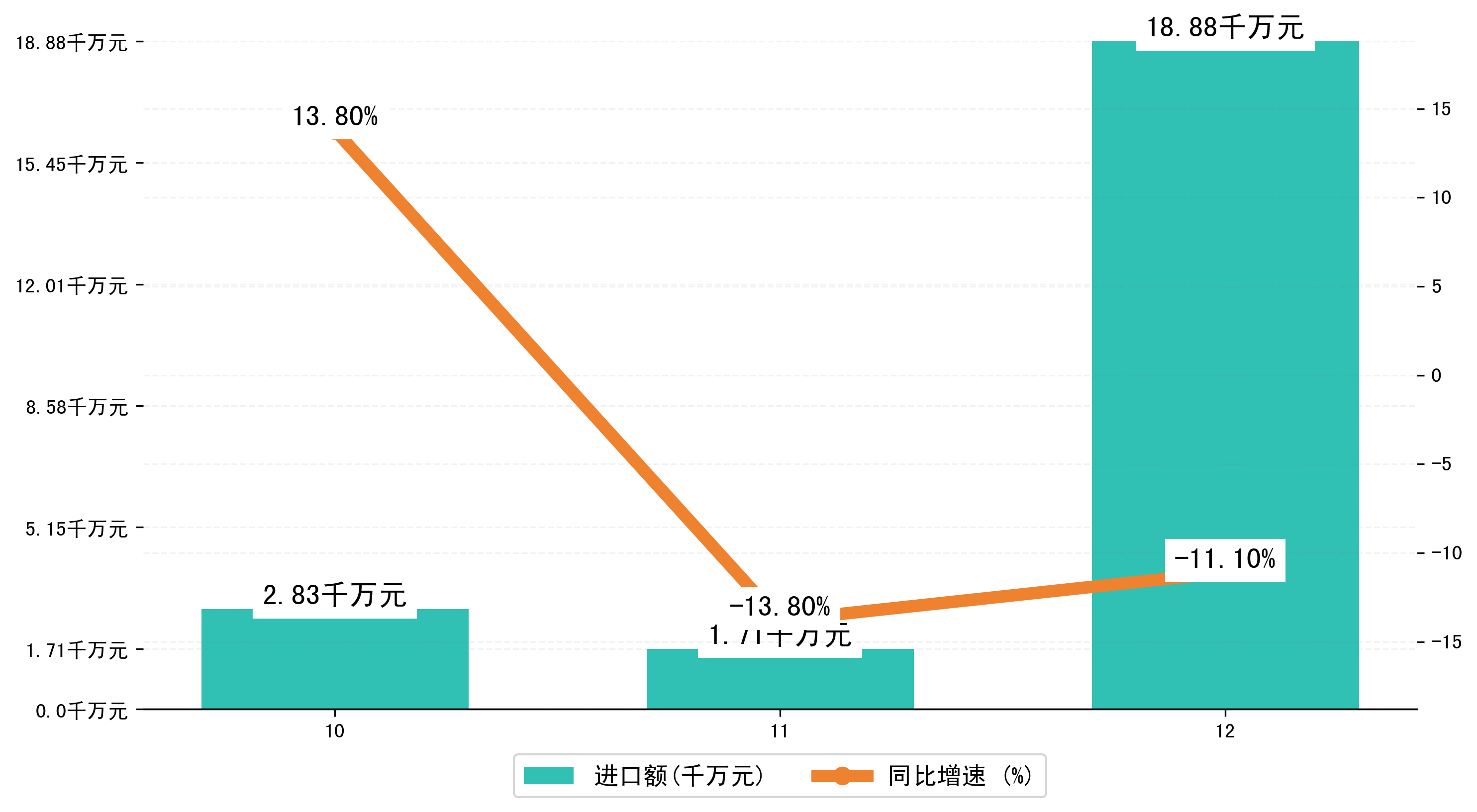 以人民币计,2024年12月萍乡市进口额为1,8882.8084万元,相比上月增加了1,7169.9704万元;相比上年同期增加了835.1012万元,同比减少了-11.10%。