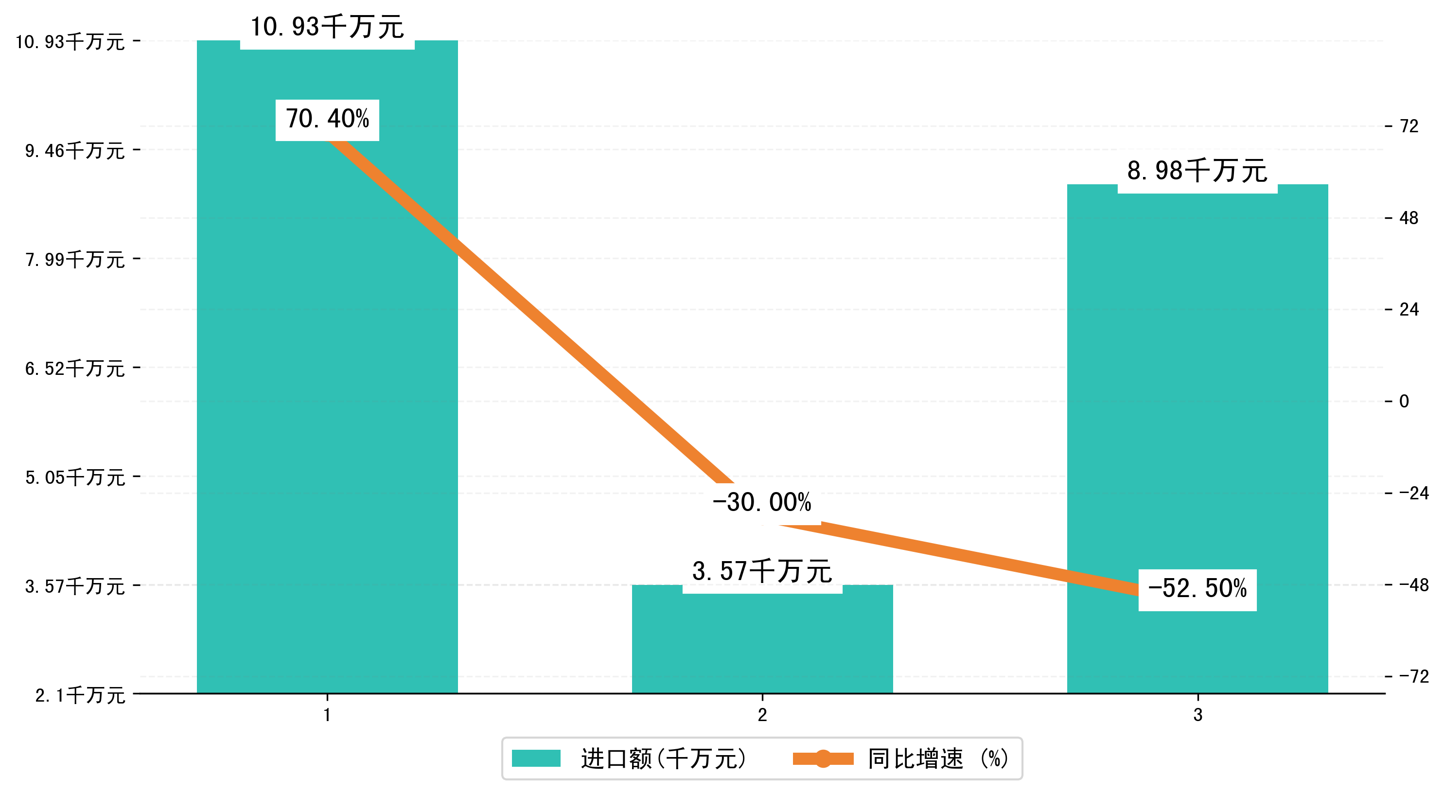 以人民币计,2025年3月萍乡市进口额为8983.9802万元,相比上月增加了5410.1976万元;相比上年同期减少了1,9776.054万元,同比减少了-52.50%。