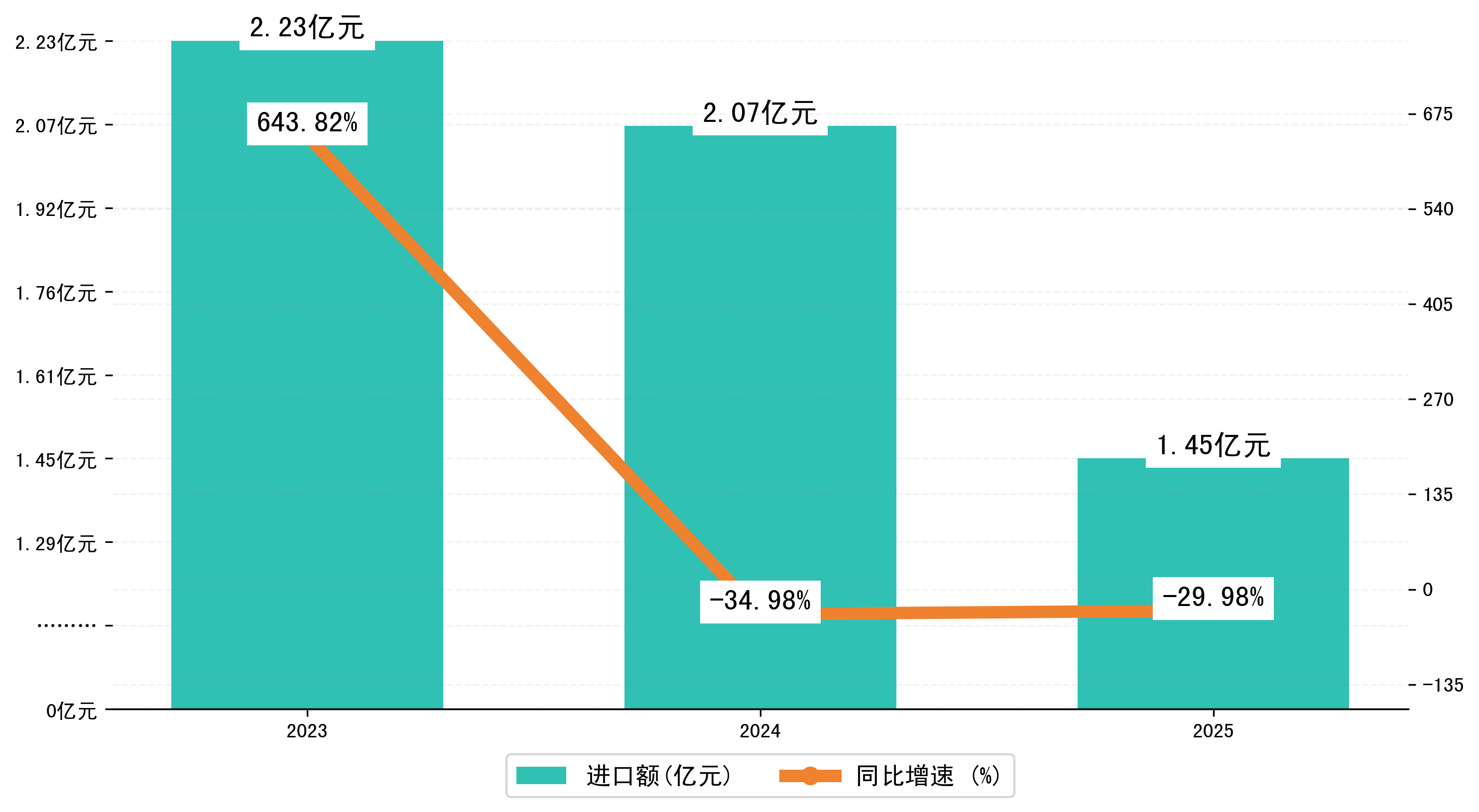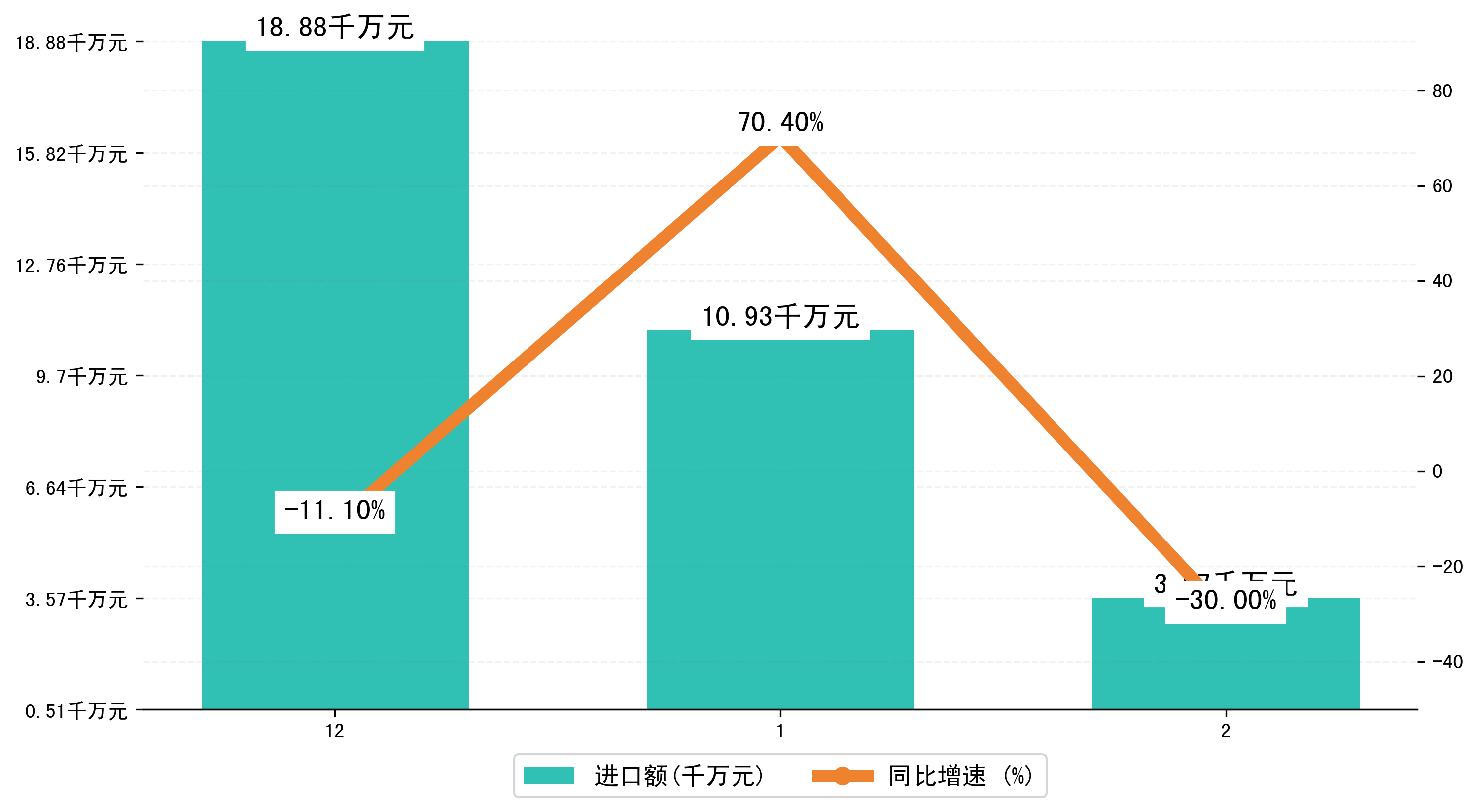 以美元计,2025年2月萍乡市进口额为500.0331万美元,相比上月减少了1014.8263万美元;相比上年同期减少了1502.7921万美元,同比减少-30.80%。