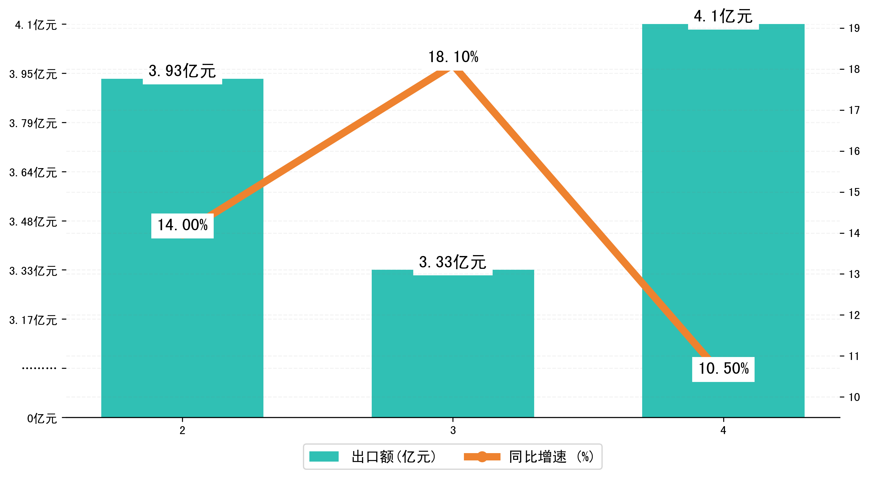 以人民币计,2025年1-4月萍乡市出口额为15,6939.3924万元,相比上年同期增加了1,5037.4728万元,同比增加了10.50%。