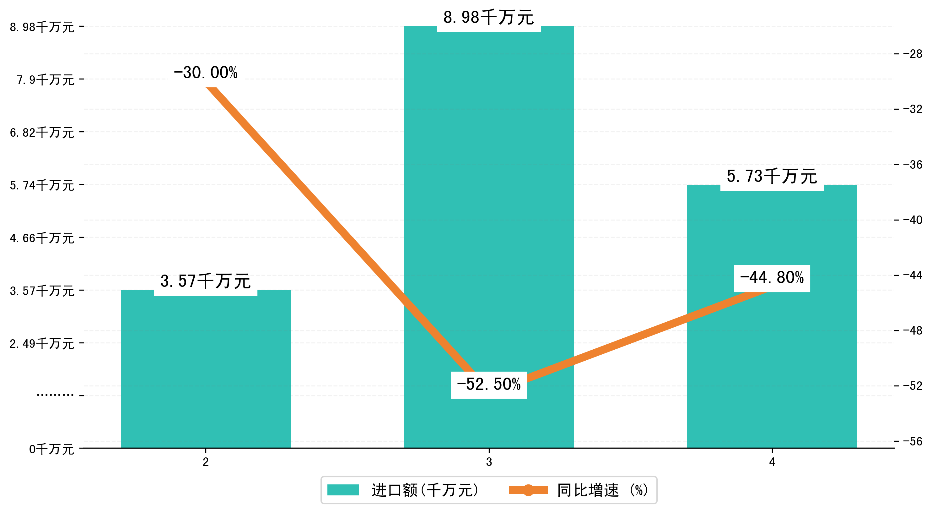 以美元计,2025年1-4月萍乡市进口额为4064.2259万美元,相比上年同期减少了3359.6999万美元,同比减少-45.30%。