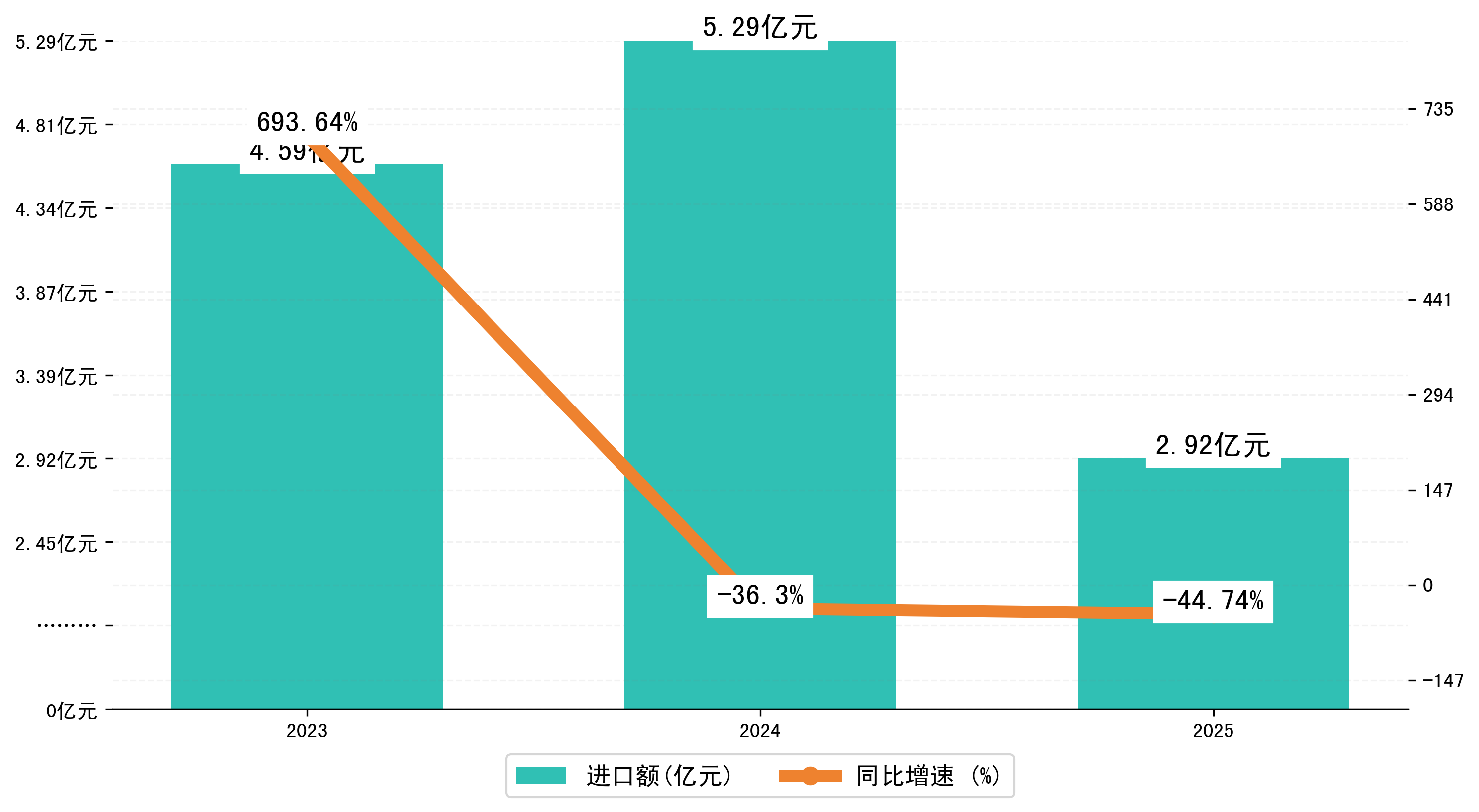 以美元计,2025年4月萍乡市进口额为797.1484万美元,相比上月减少了455.0366万美元;相比上年同期增加了320.8385万美元,同比减少-45.30%。
