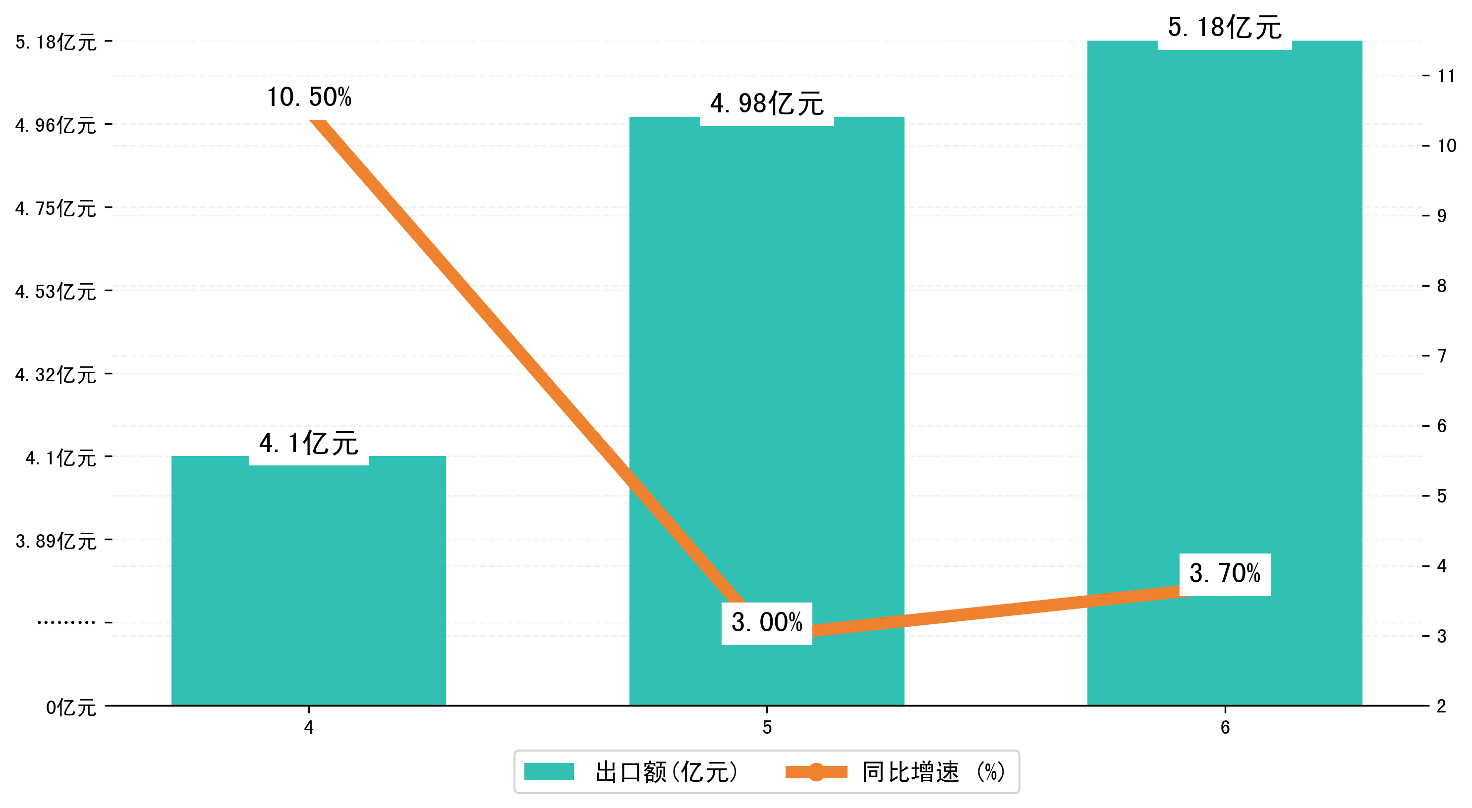 以人民币计,2025年6月萍乡市出口额为5,1787.5122万元,相比上月增加了1971.7573万元;相比上年同期增加了3218.2705万元,同比增加了3.70%。