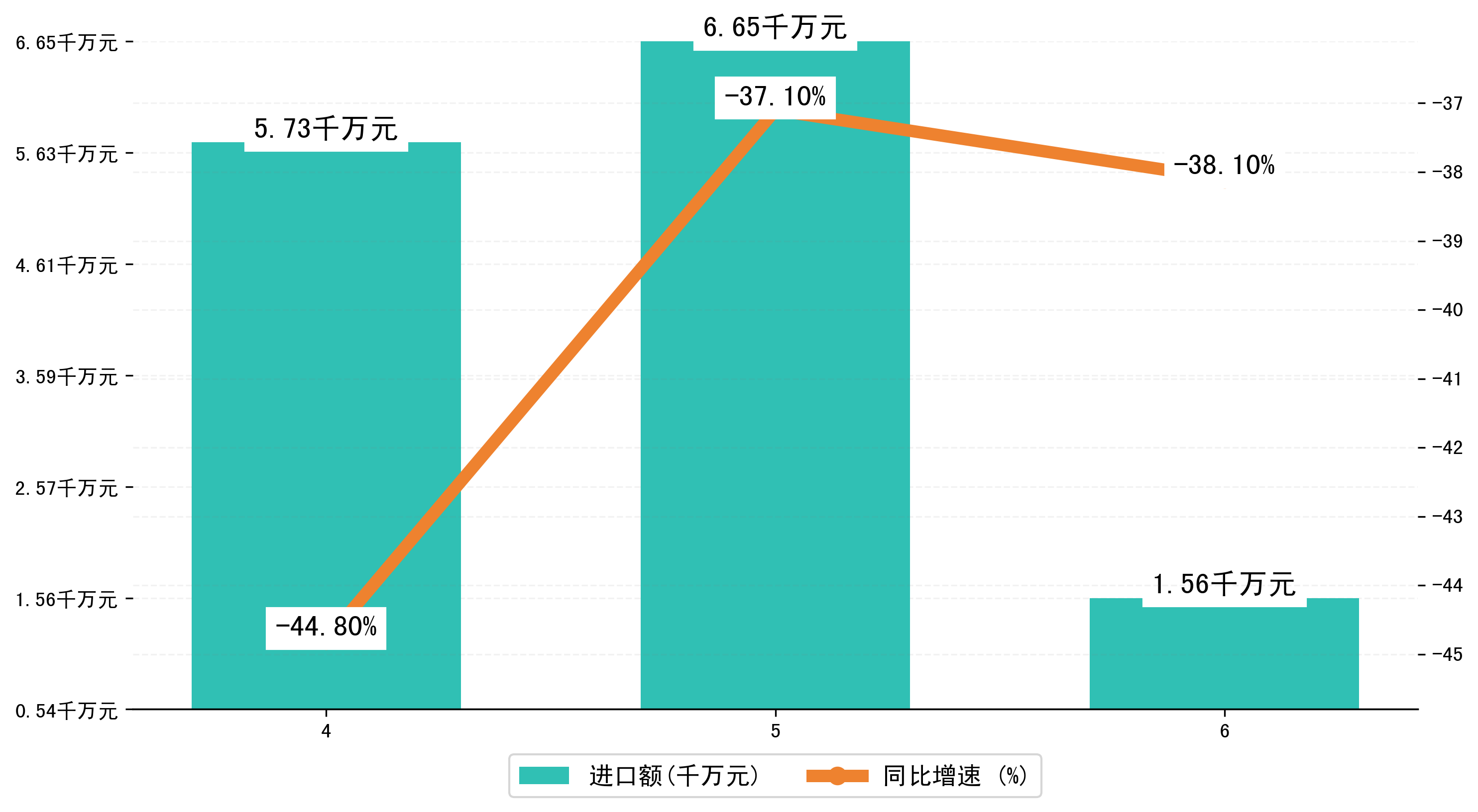 以人民币计,2025年6月萍乡市进口额为1555.5713万元,相比上月减少了5097.0974万元;相比上年同期减少了1831.6567万元,同比减少了-38.10%。