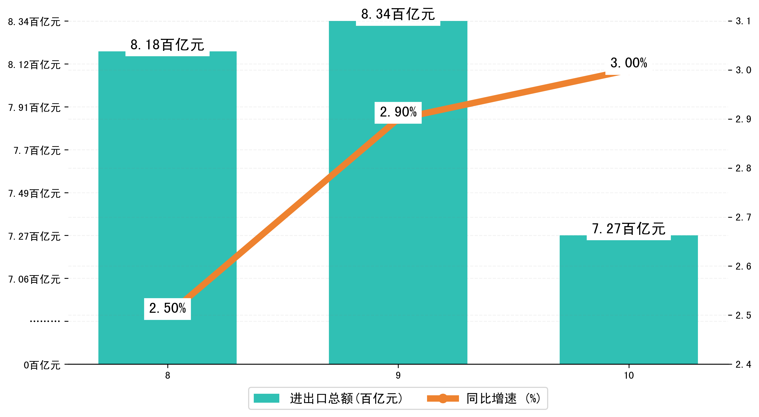 以人民币计,2024年10月青岛市进出口总额为727,4673.7545万元,相比上月减少了106,0895.3805万元;相比上年同期增加了23,4944.5001万元,同比增加了3.00%。