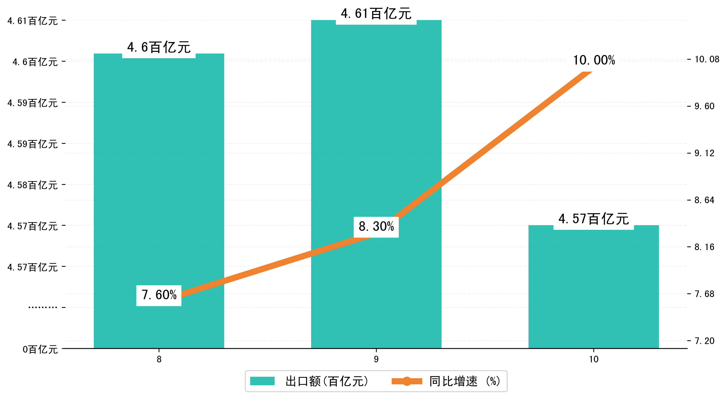以美元计,2024年1-10月青岛市出口额为611,4676.416万美元,相比上年同期增加了45,1846.7931万美元,同比增加8.40%。