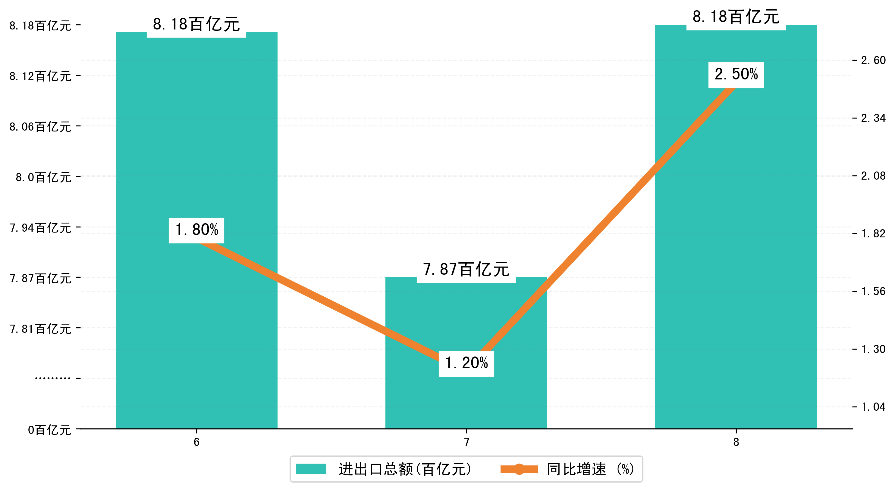 以人民币计,2024年8月青岛市进出口总额为818,4759.1215万元,相比上月增加了31,0242.6566万元;相比上年同期增加了84,4850.4286万元,同比增加了2.50%。