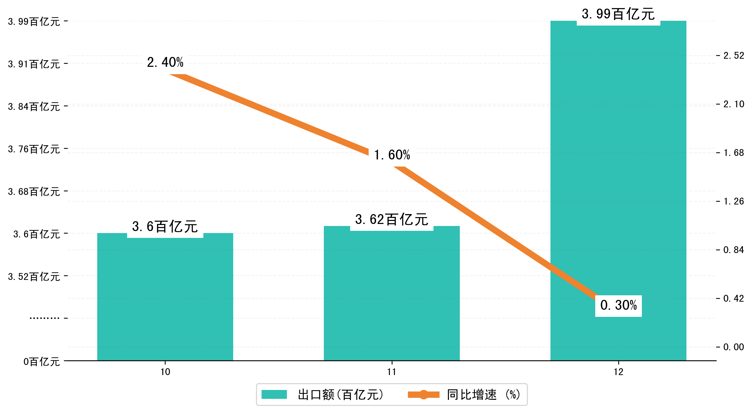 以人民币计,2023年12月青岛市出口额为399,1584.1848万元,相比上月增加了37,6548.6051万元;相比上年同期减少了156,8758.6218万元,同比增加了0.30%。