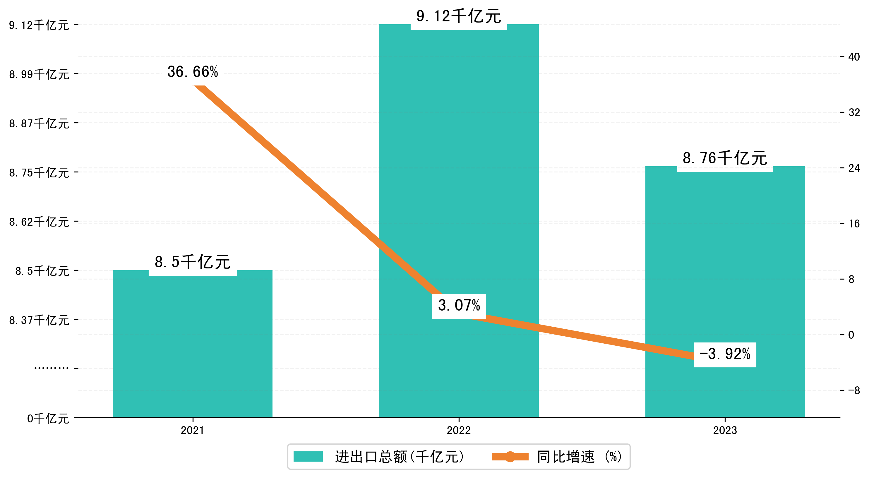 以人民币计,2023年1-12月青岛市进出口总额为8759,7326.6212万元,相比上年同期减少了357,4310.2823万元,同比增加了4.60%。