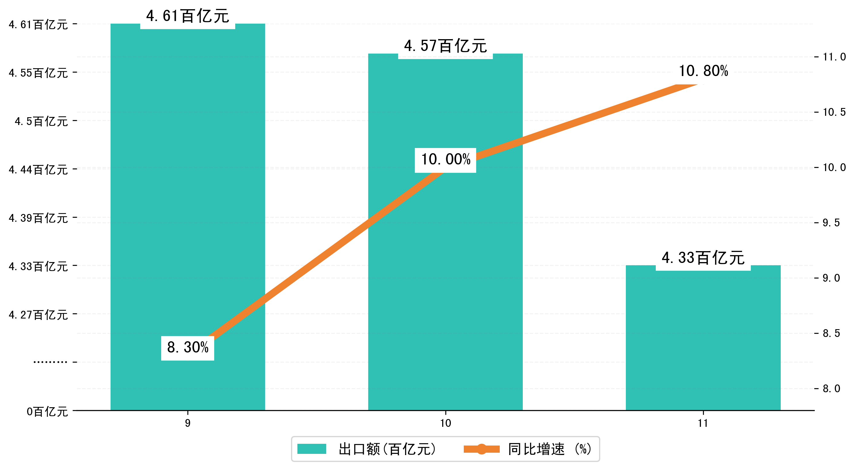 以人民币计,2024年11月青岛市出口额为432,9510.9344万元,相比上月减少了24,3143.8483万元;相比上年同期增加了71,4475.3547万元,同比增加了10.80%。