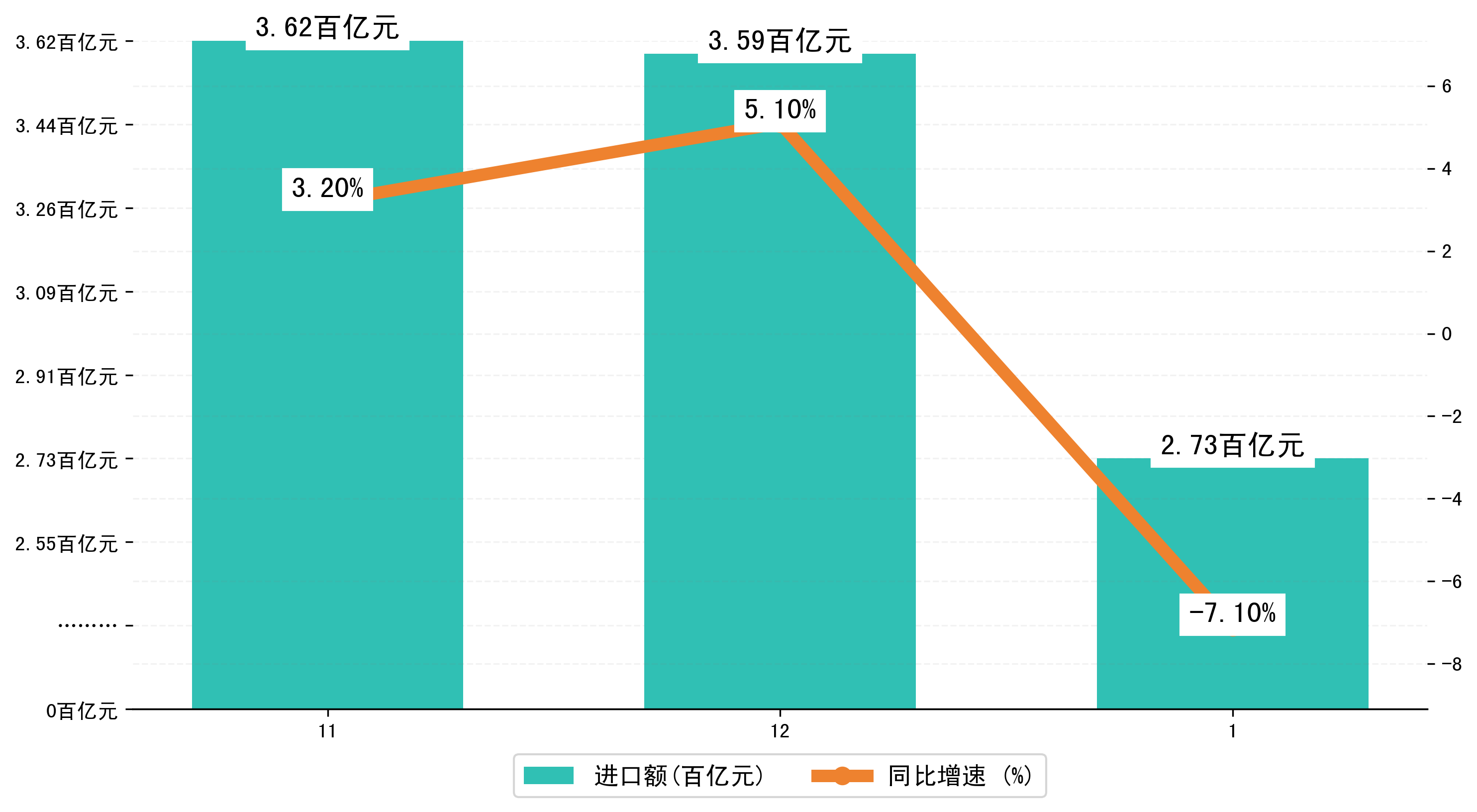 以人民币计,2023年1-1月青岛市进口额为272,8829.4944万元,相比上年同期减少了17,0296.9727万元,同比减少了-7.10%。