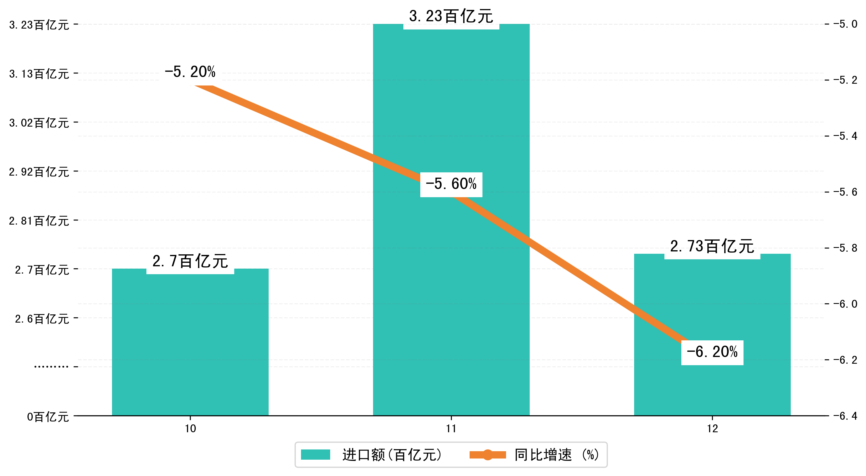 以人民币计,2024年12月青岛市进口额为273,4735.4896万元,相比上月减少了50,0151.275万元;相比上年同期减少了42,4436.4253万元,同比减少了-6.20%。