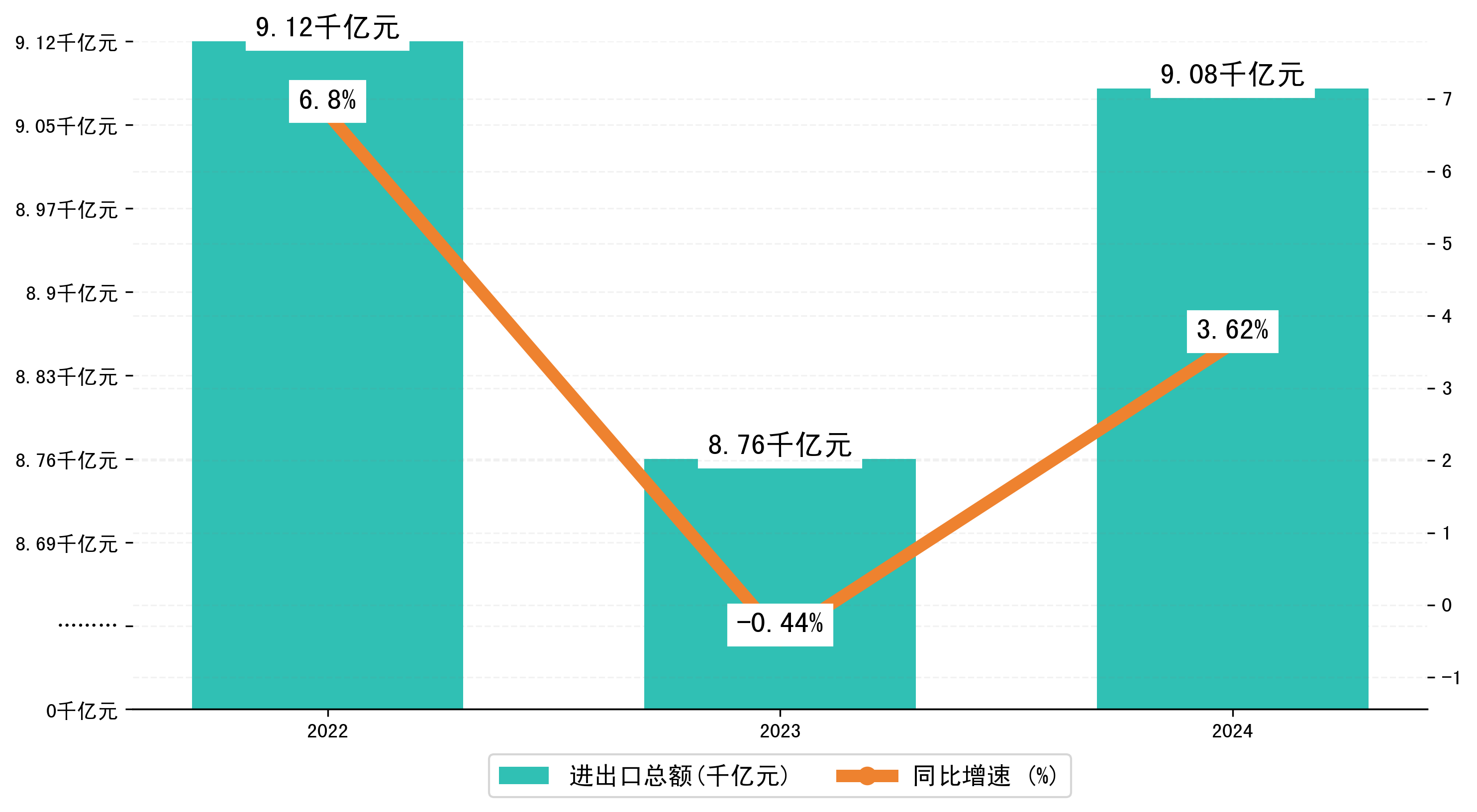 以人民币计,2024年1-12月青岛市进出口总额为9076,7221.1156万元,相比上年同期增加了316,9894.4944万元,同比增加了3.60%。
