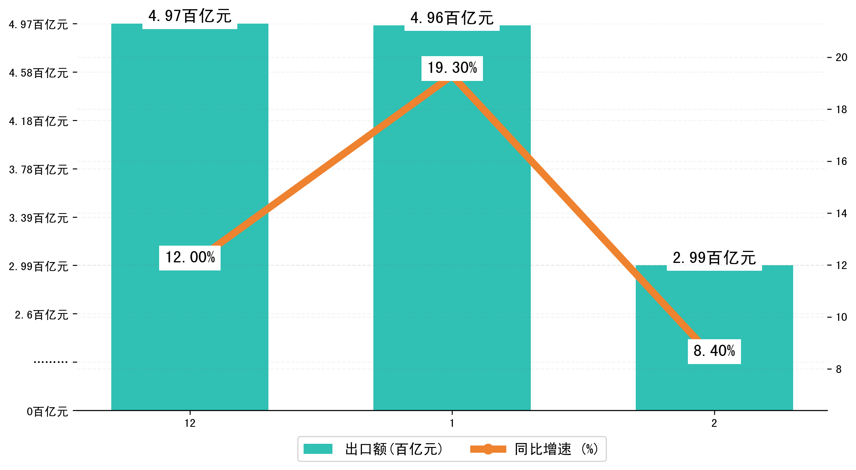 以人民币计,2025年1-2月青岛市出口额为795,0009.4648万元,相比上年同期增加了64,5488.9206万元,同比增加了8.40%。