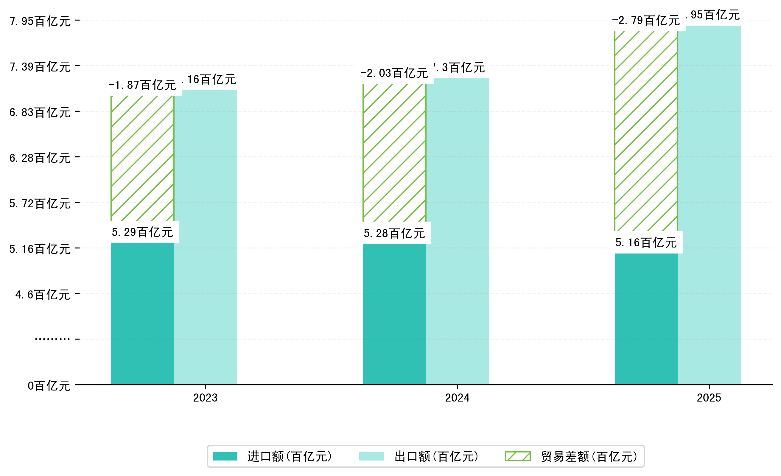 以人民币计,2025年1-2月青岛市贸易差额为279,1102,3408万元(贸易顺差),相比上年同期增加了76,1689,4031万元,同比增加37.53%。