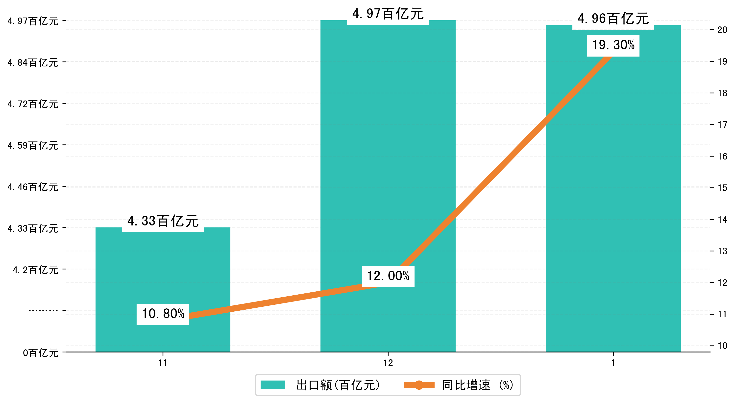 以人民币计,2025年1-1月青岛市出口额为495,7473.4056万元,相比上年同期增加了80,9883.3887万元,同比增加了19.30%。