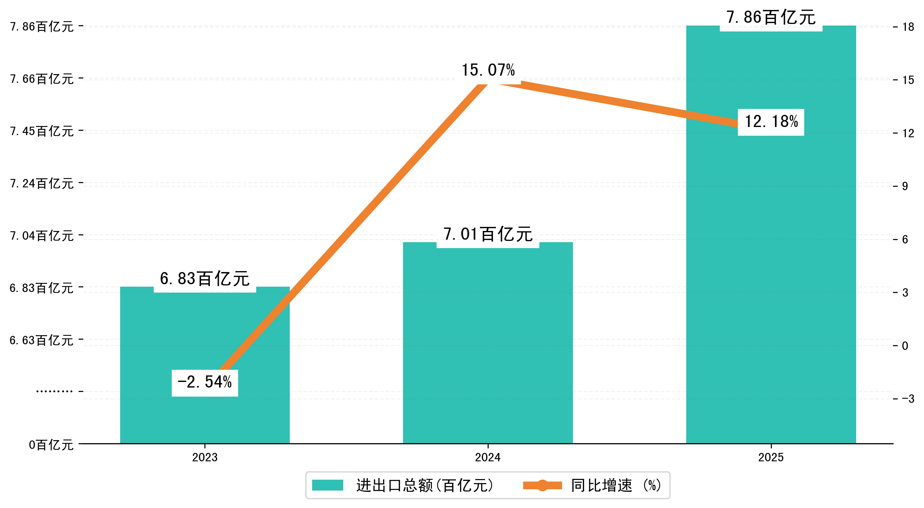 以人民币计,2025年1月青岛市进出口总额为786,1563.8563万元,相比上月增加了15,4109.28万元;相比上年同期增加了85,3477.5091万元,同比增加了11.90%。