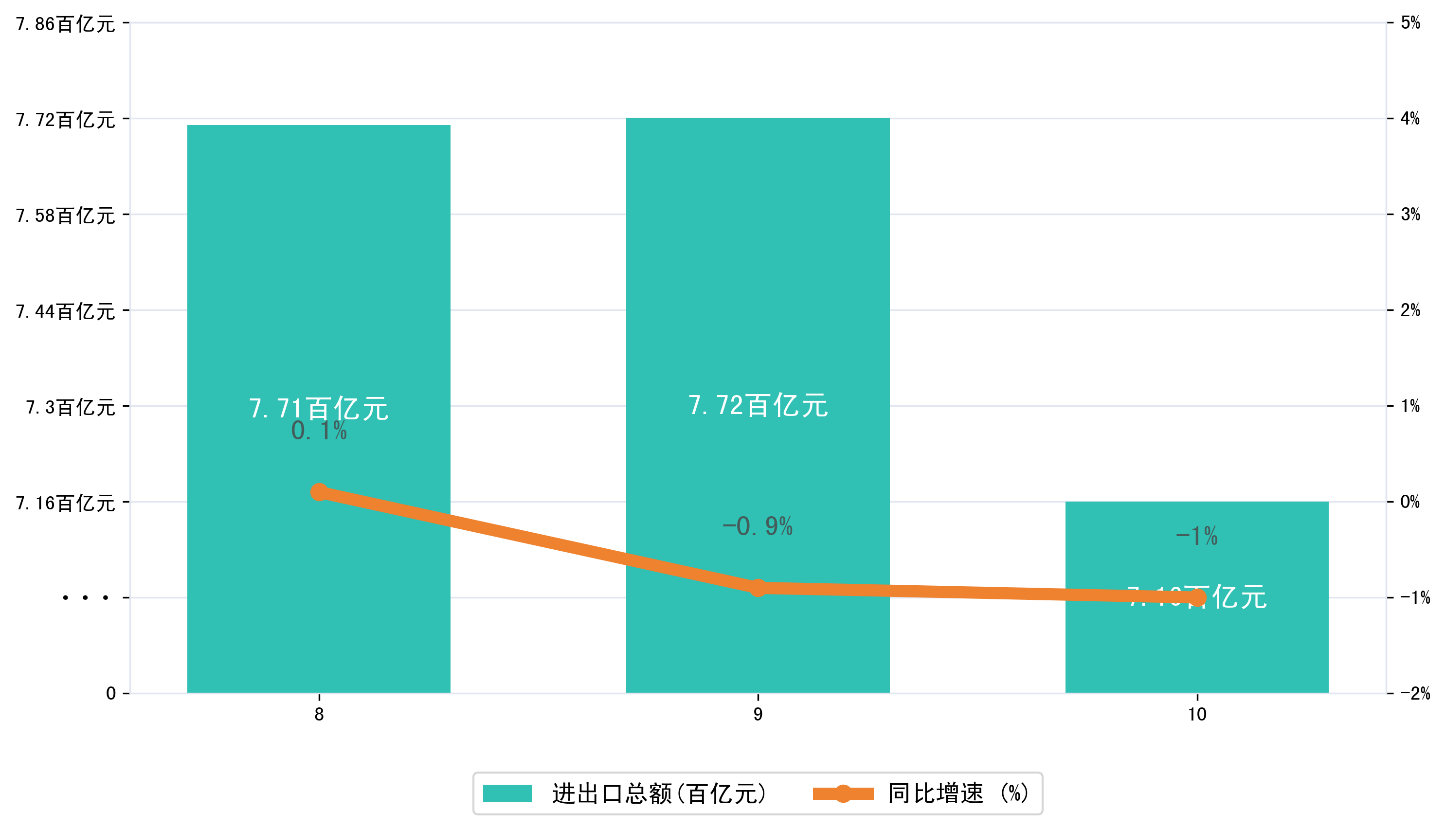 以人民币计,2025年10月青岛市进出口总额为716,2938.3803万元,相比上月减少了55,6774.9707万元;相比上年同期减少了11,1735.3742万元,同比减少了-1.00%。