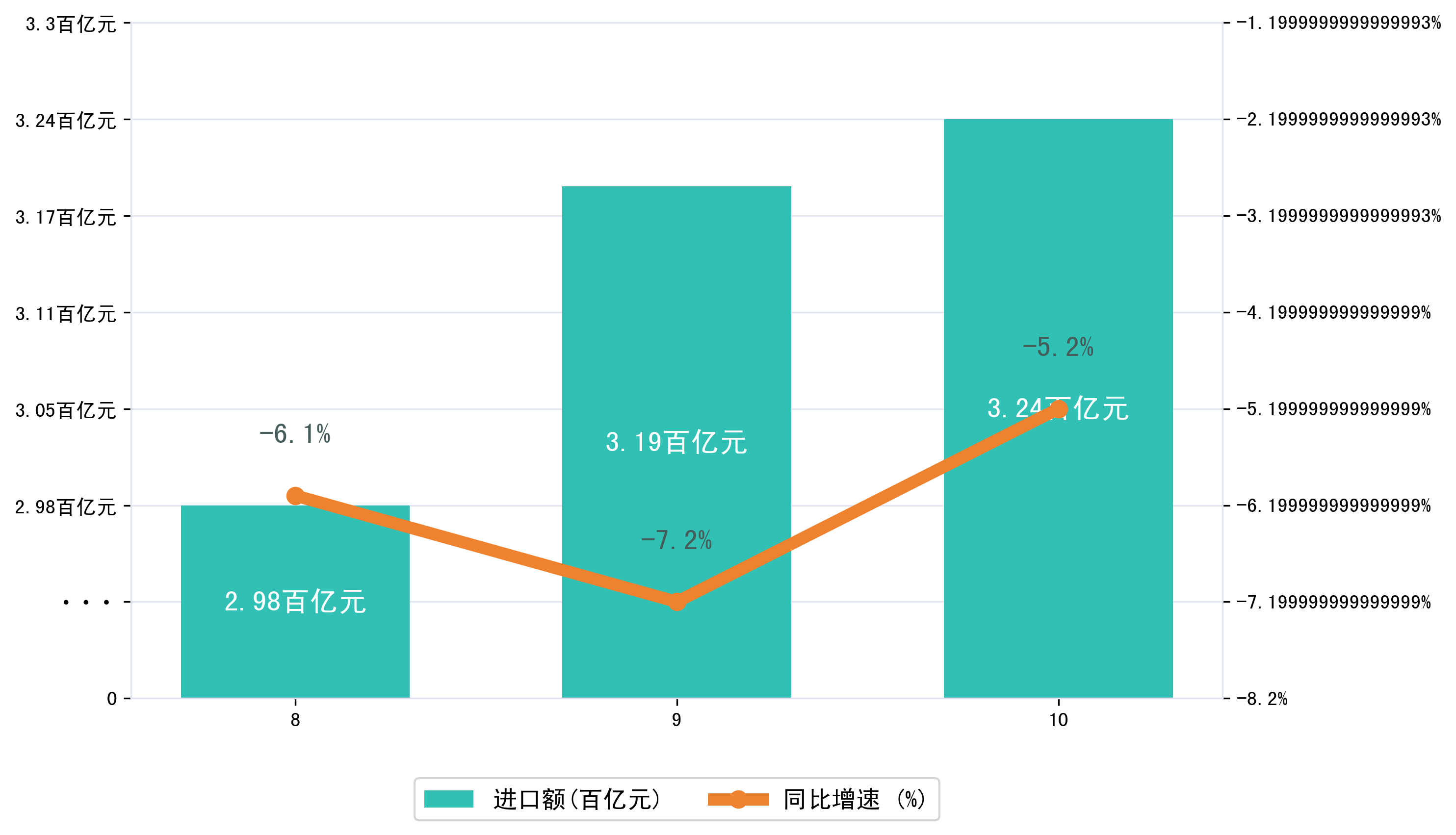 以人民币计,2025年10月青岛市进口额为323,8586.2941万元,相比上月增加了4,4606.7819万元;相比上年同期增加了53,6567.3223万元,同比减少了-5.20%。