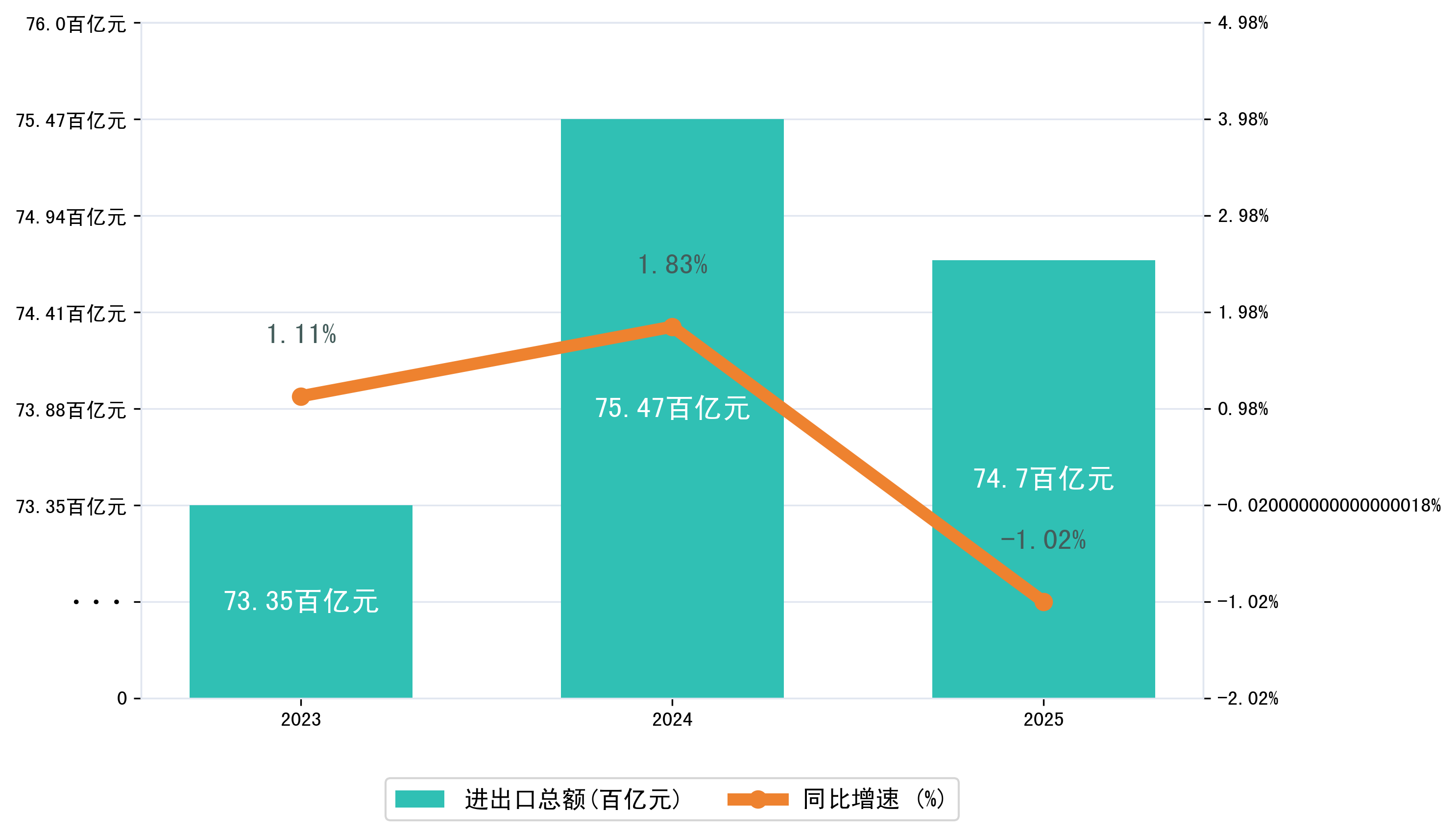 以人民币计,2025年1-10月青岛市进出口总额为7469,9356.5221万元,相比上年同期减少了77,2649.9788万元,同比减少了-1.00%。