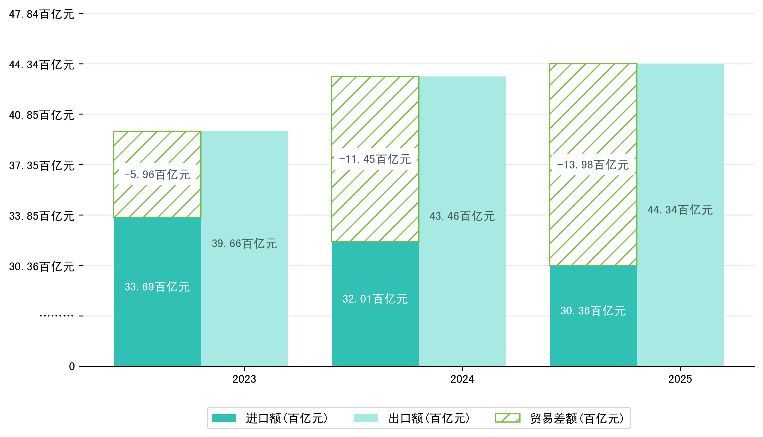 以人民币计,2025年1-10月青岛市贸易差额为1398,3923,7699万元(贸易顺差),相比上年同期增加了253,1825,3758万元,同比增加22.11%。