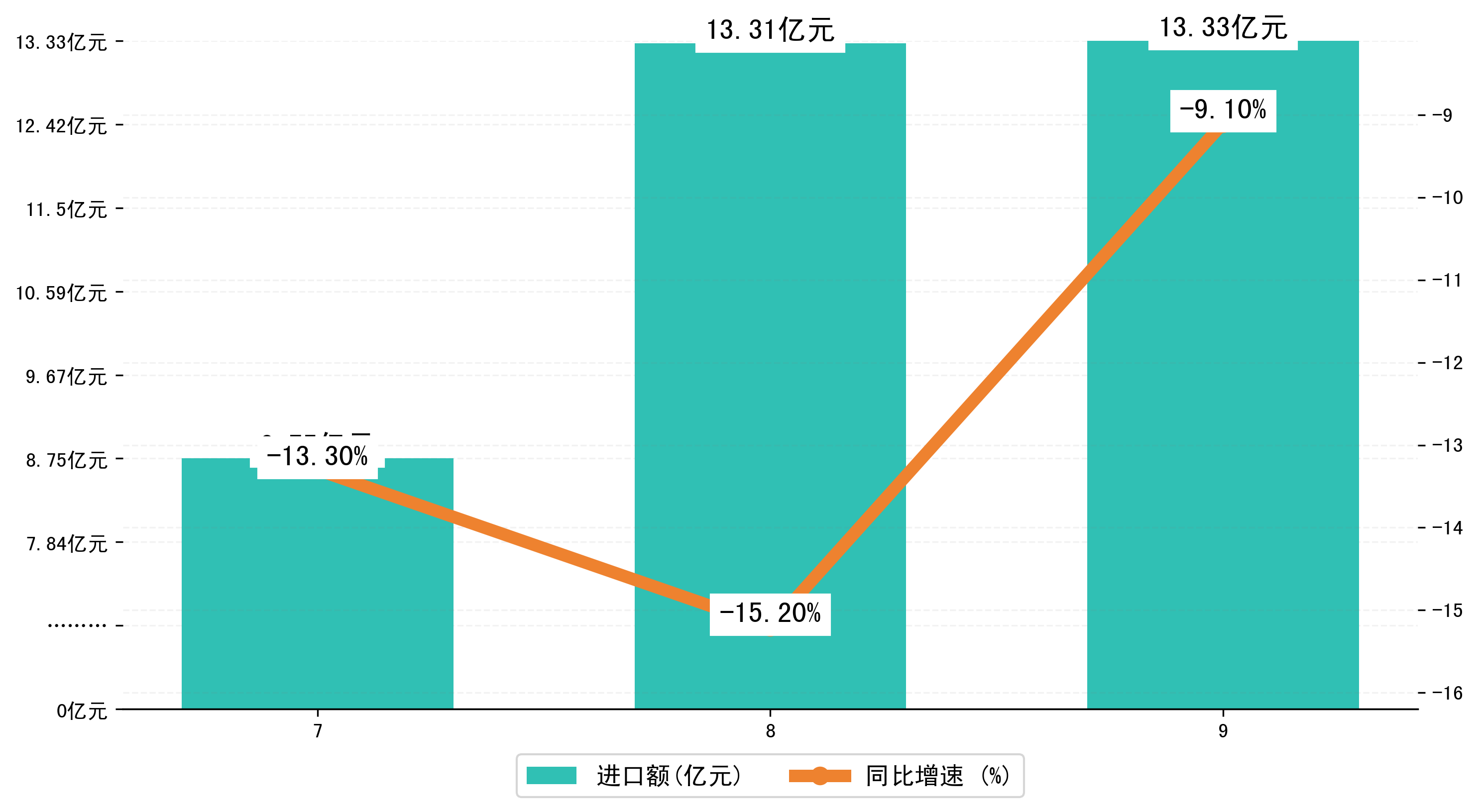 以人民币计,2024年9月秦皇岛市进口额为13,3342.1922万元,相比上月增加了276.9605万元;相比上年同期增加了5,8257.2789万元,同比减少了-9.10%。