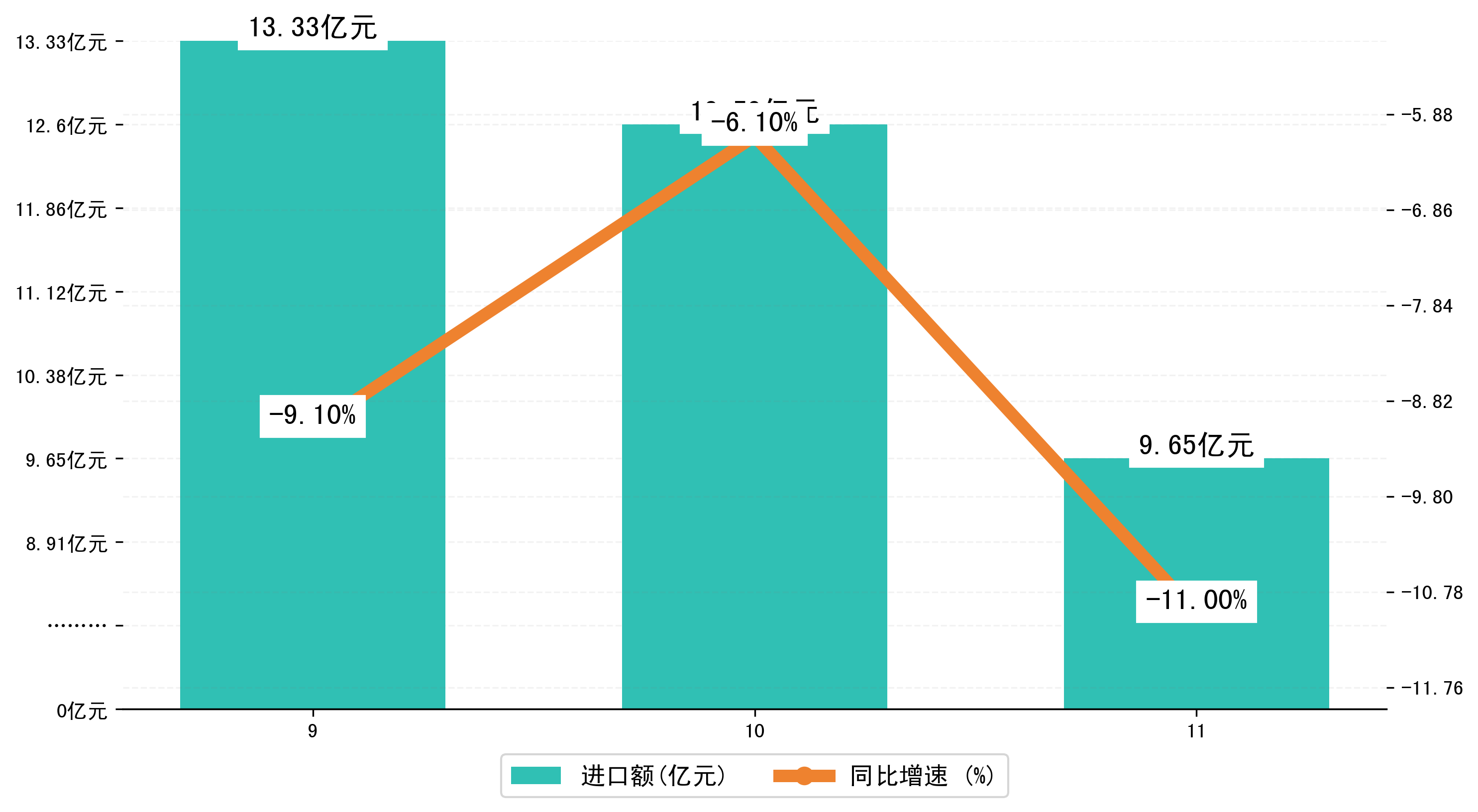 以美元计,2024年1-11月秦皇岛市进口额为17,3013.109万美元,相比上年同期减少了2,3509.3525万美元,同比减少-11.90%。