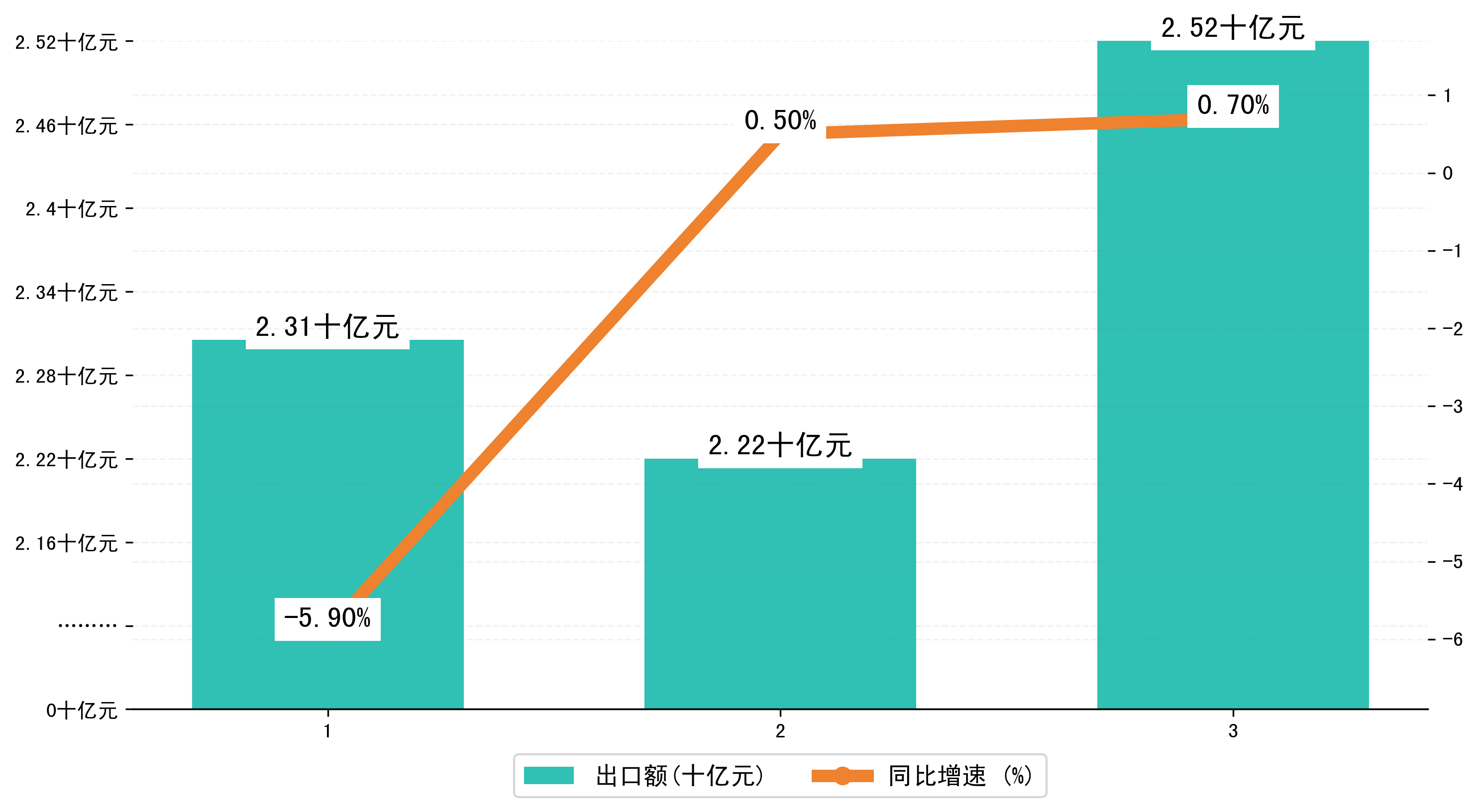 以人民币计,2025年1-3月秦皇岛市出口额为70,4383.1737万元,相比上年同期减少了839.8898万元,同比增加了0.70%。