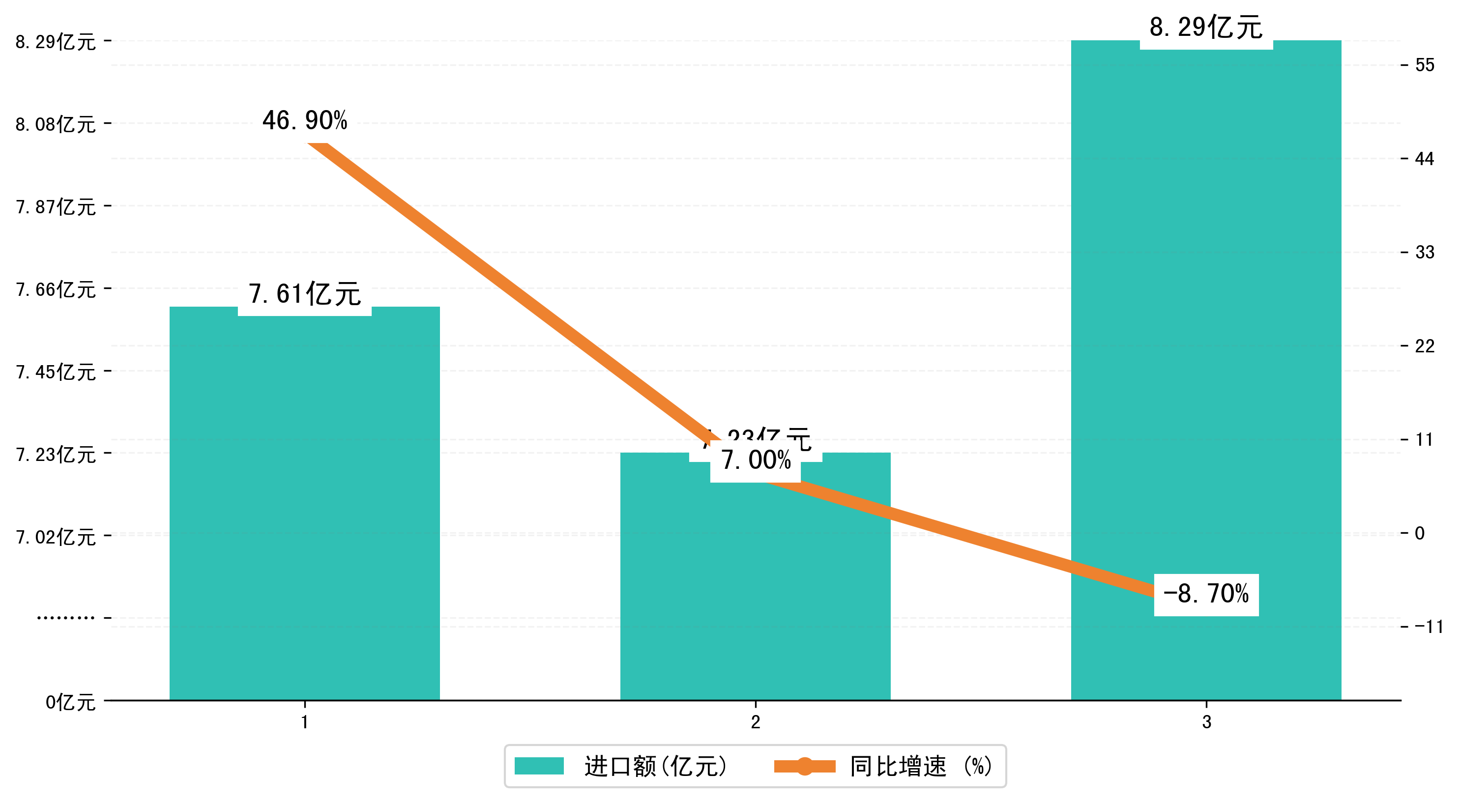 以人民币计,2025年3月秦皇岛市进口额为8,2882.4335万元,相比上月增加了1,0535.8577万元;相比上年同期减少了3,4230.8919万元,同比减少了-8.70%。