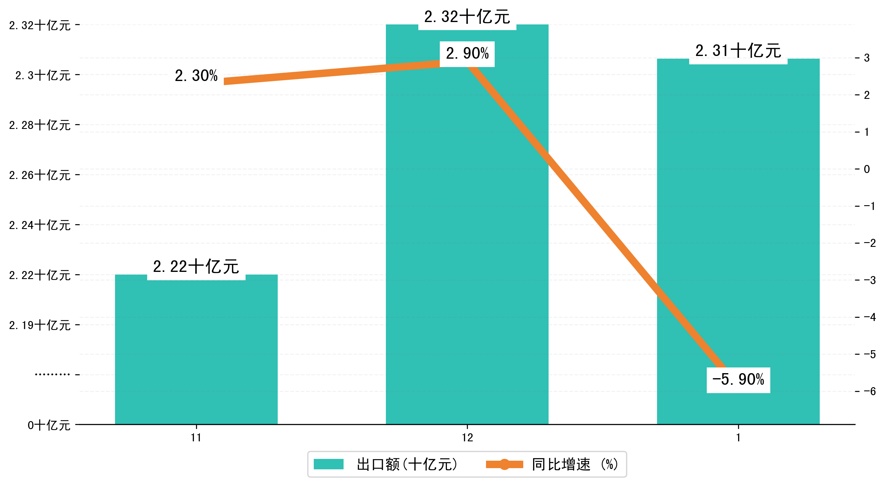 以美元计,2025年1-1月秦皇岛市出口额为3,1997.4489万美元,相比上年同期减少了2591.9734万美元,同比减少-7.50%。