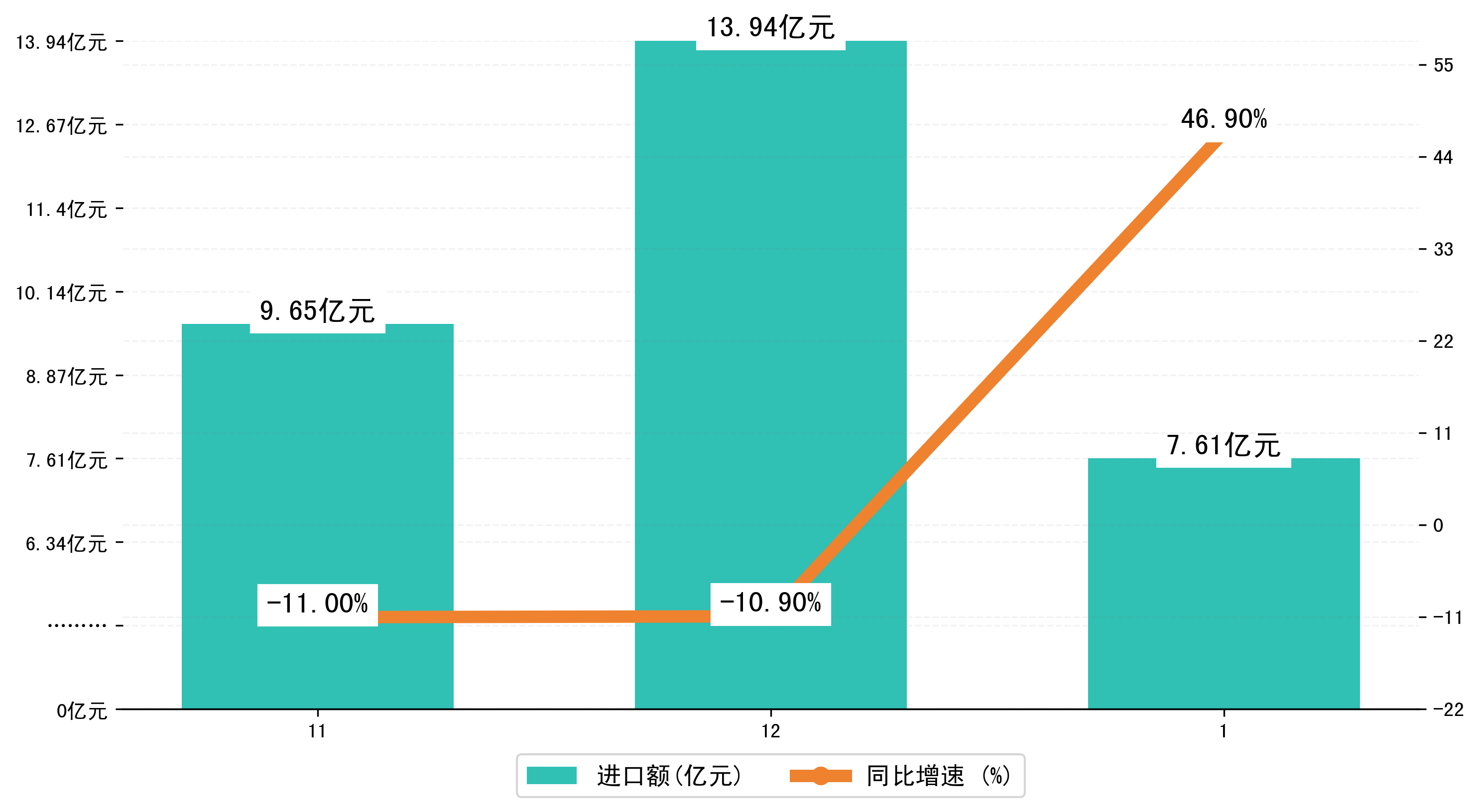 以美元计,2025年1-1月秦皇岛市进口额为1,0574.24万美元,相比上年同期增加了3311.5085万美元,同比增加44.90%。