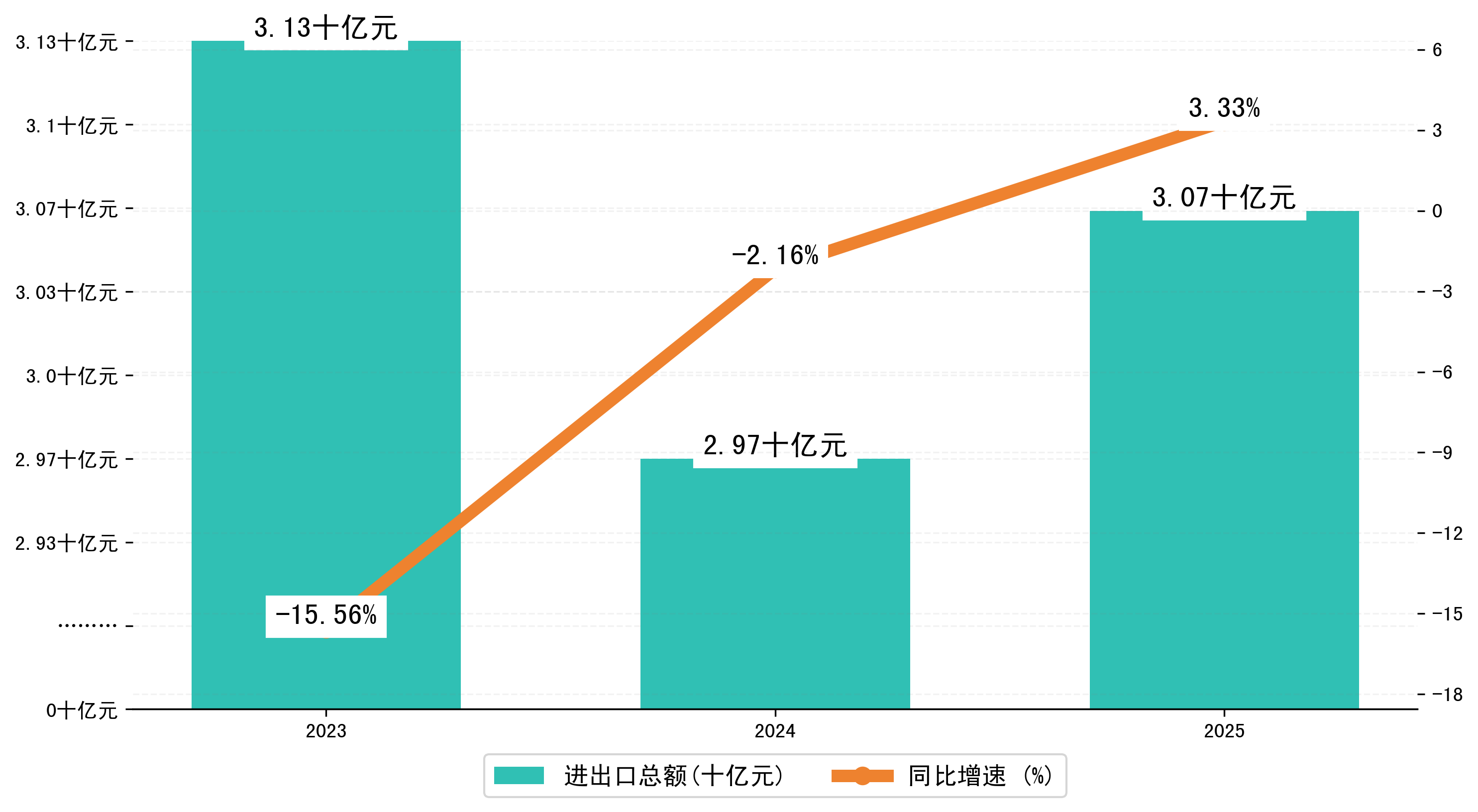 以人民币计,2025年1-1月秦皇岛市进出口总额为30,6656.5665万元,相比上年同期增加了9879.8002万元,同比增加了3.30%。