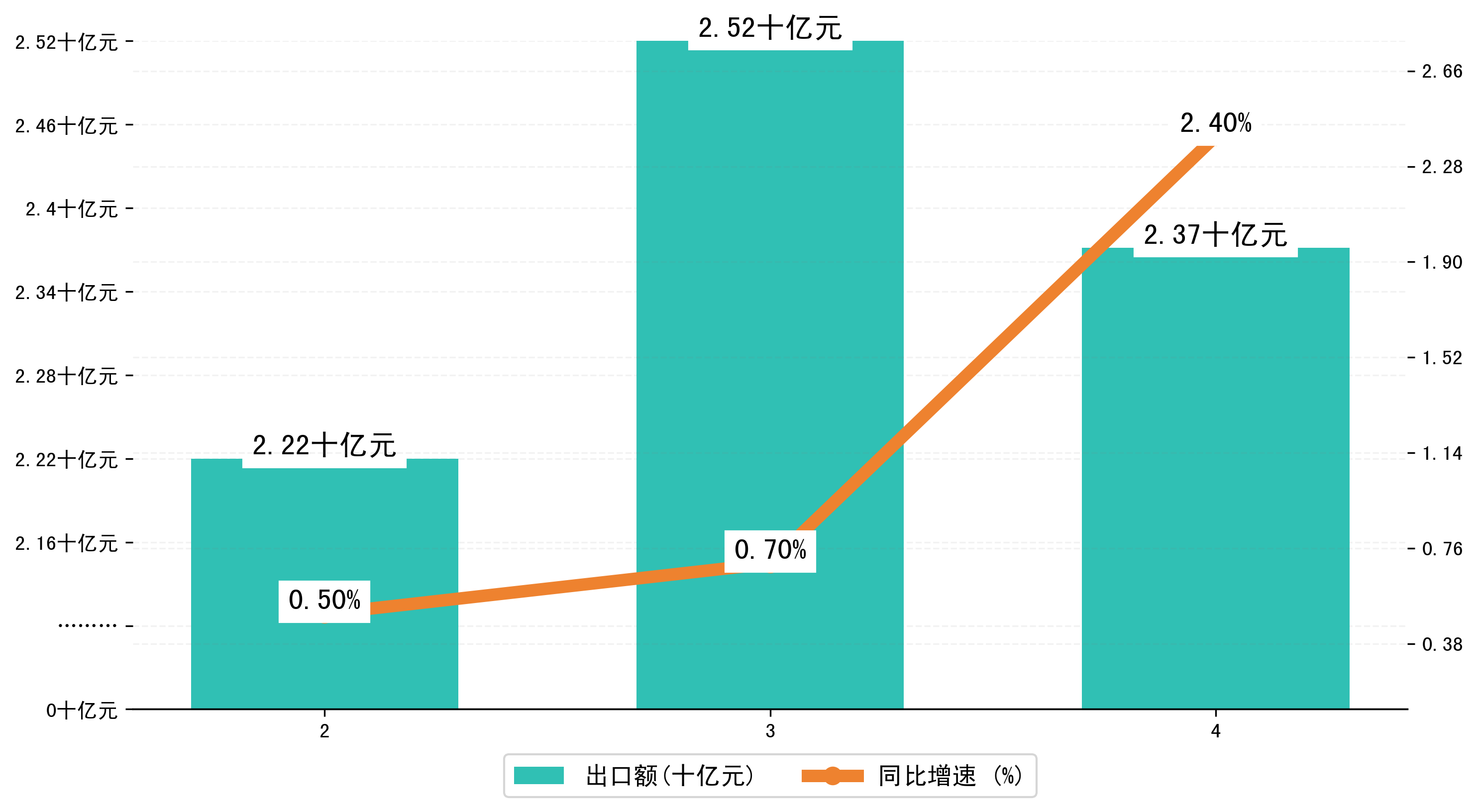 以人民币计,2025年1-4月秦皇岛市出口额为94,1408.0153万元,相比上年同期增加了1,5753.2597万元,同比增加了2.40%。