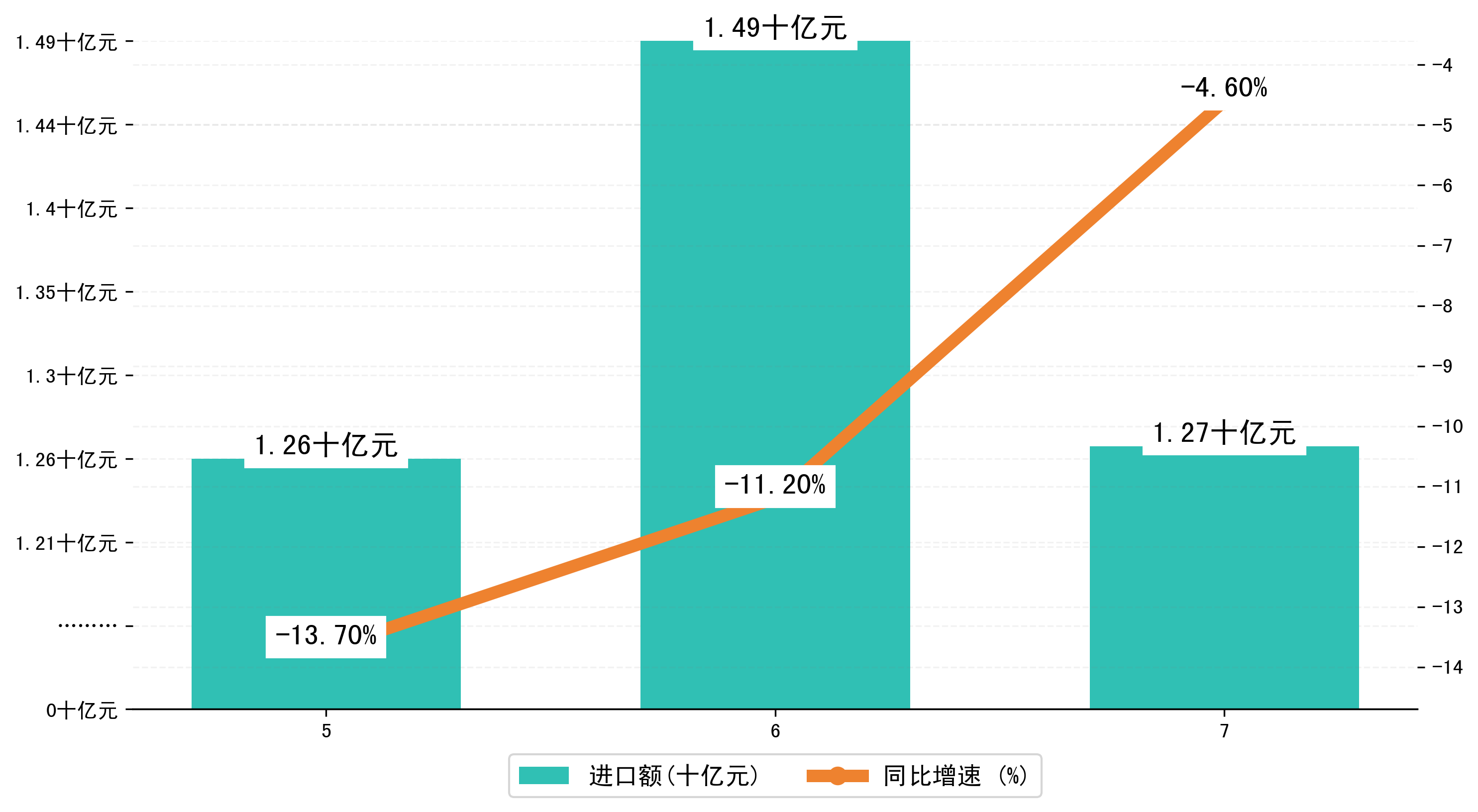 以美元计,2025年1-7月秦皇岛市进口额为9,8327.4579万美元,相比上年同期减少了6653.4782万美元,同比减少-5.70%。