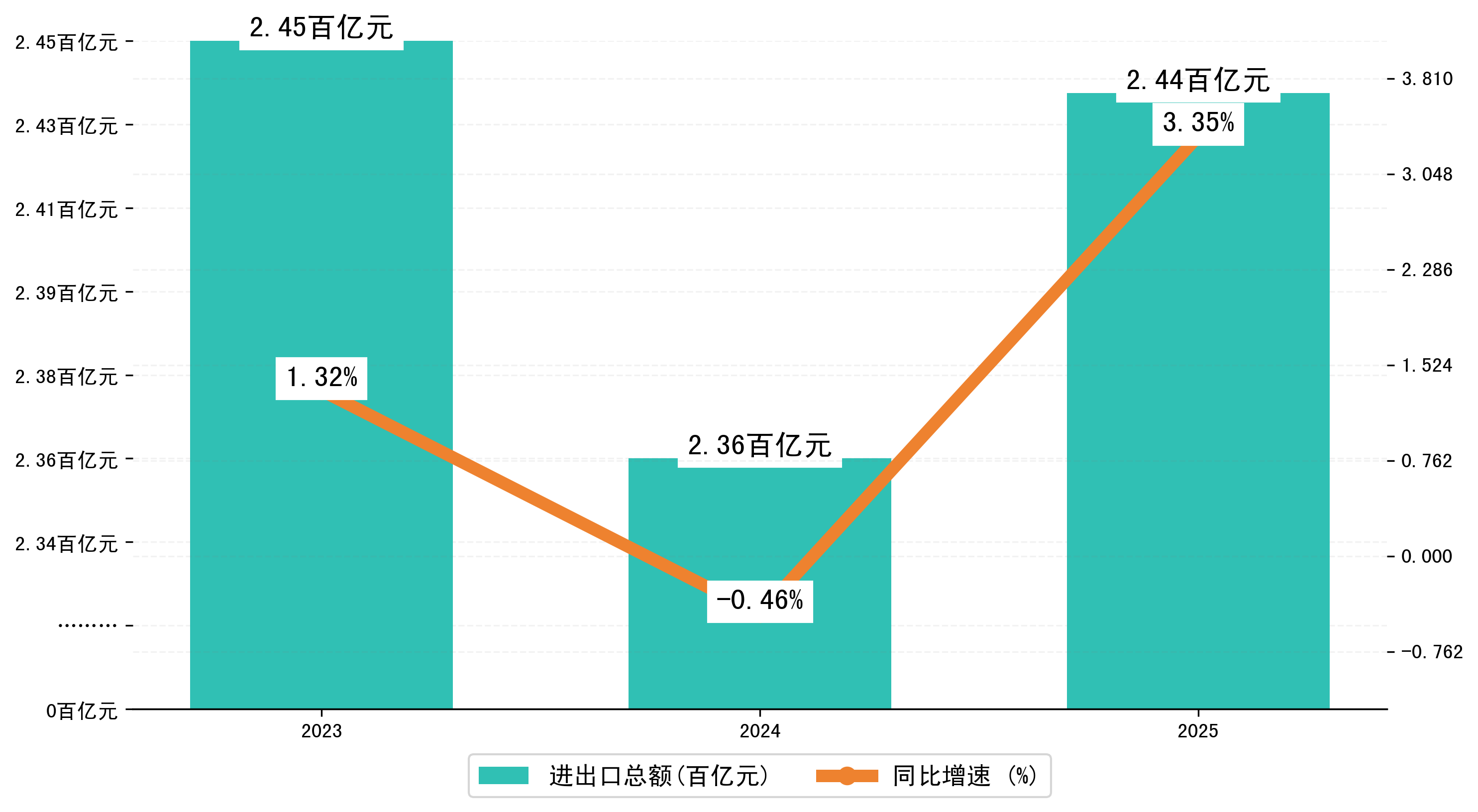 以人民币计,2025年1-7月秦皇岛市进出口总额为243,7713.4665万元,相比上年同期增加了7,9112.1178万元,同比增加了3.90%。