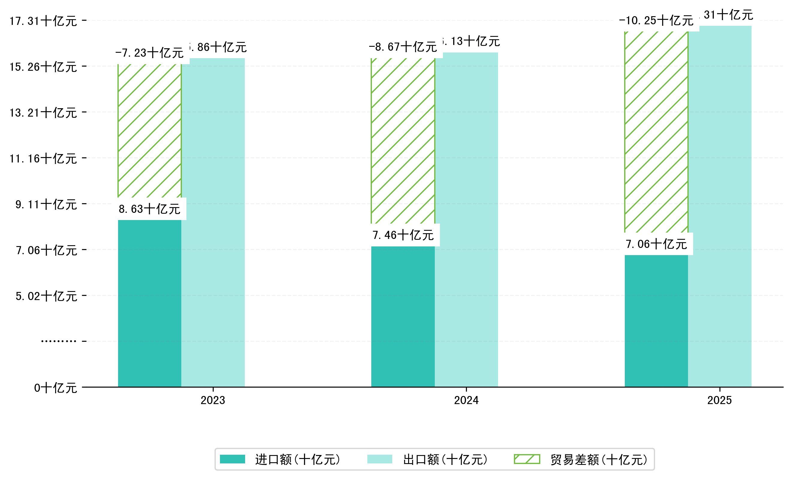 以人民币计,2025年7月秦皇岛市贸易差额为13,3661,5205万元(贸易顺差),相比上月增加了1,7951,3133万元,即2595,8131万美元;相比上年同期减少了1,2543,0240万元,同比减少-8.58%。