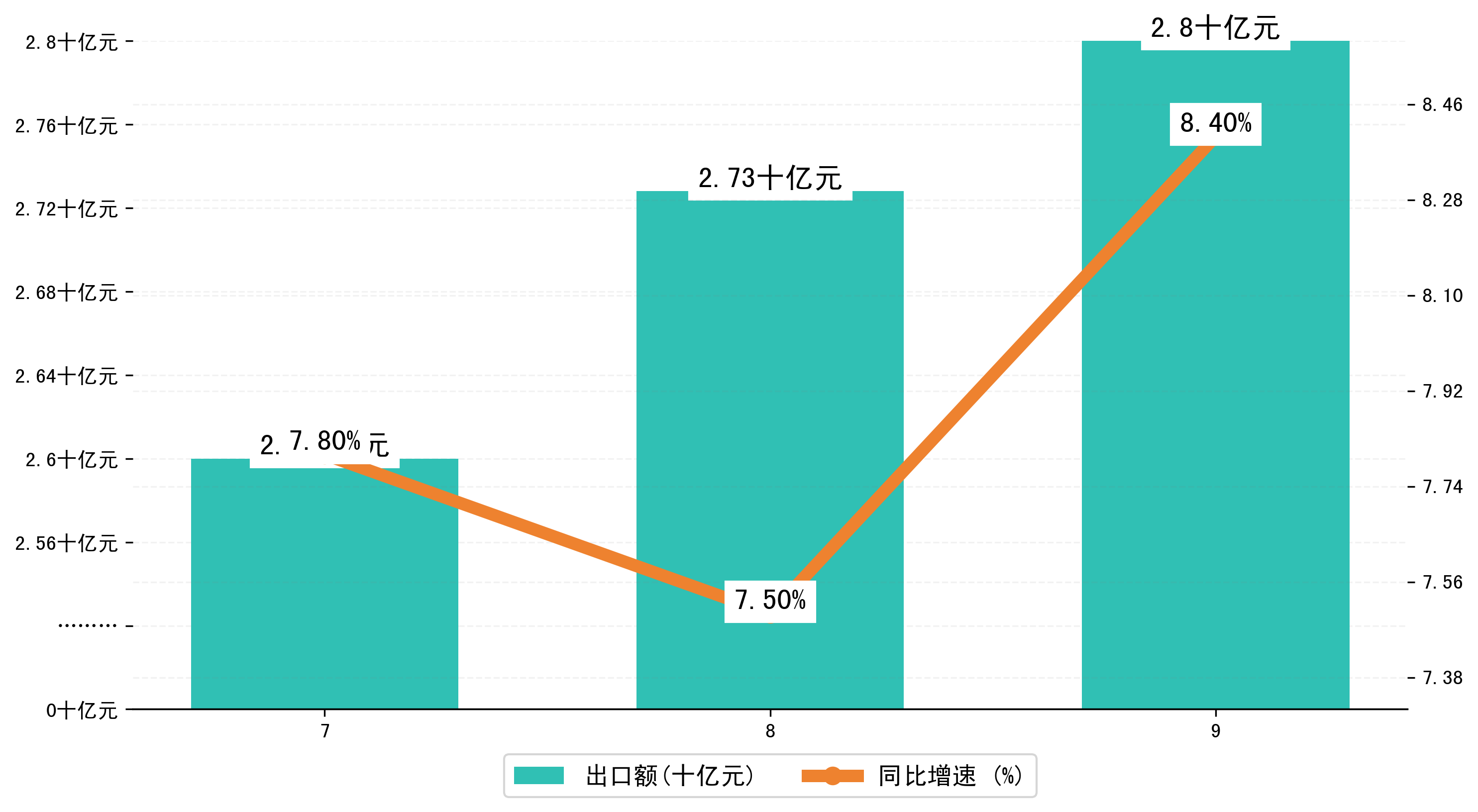 以人民币计,2025年9月秦皇岛市出口额为27,9611.8825万元,相比上月增加了6972.2692万元;相比上年同期增加了3,5711.3091万元,同比增加了8.40%。